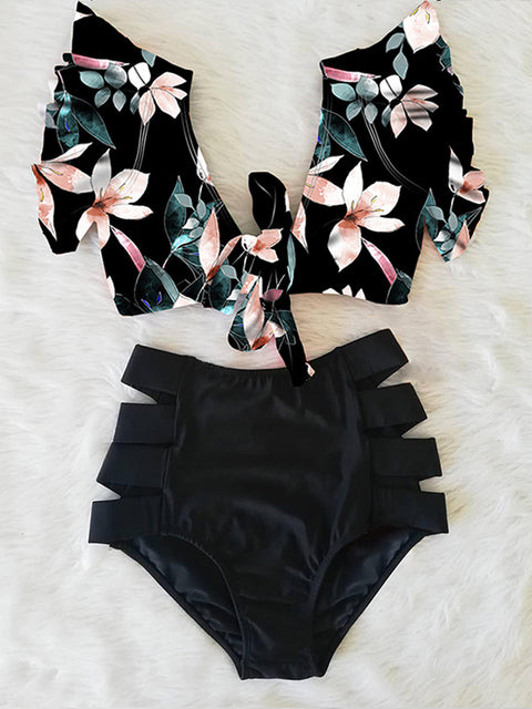 Dámské květinované plavky s vysokým pásem
