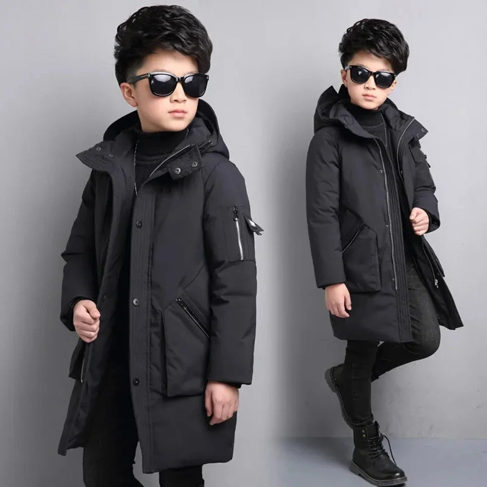 Chlapecká pohodlná péřová zimní dlouhá bunda s kapucí a kapsami. Více barev na výběr.