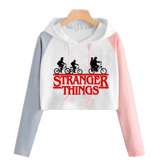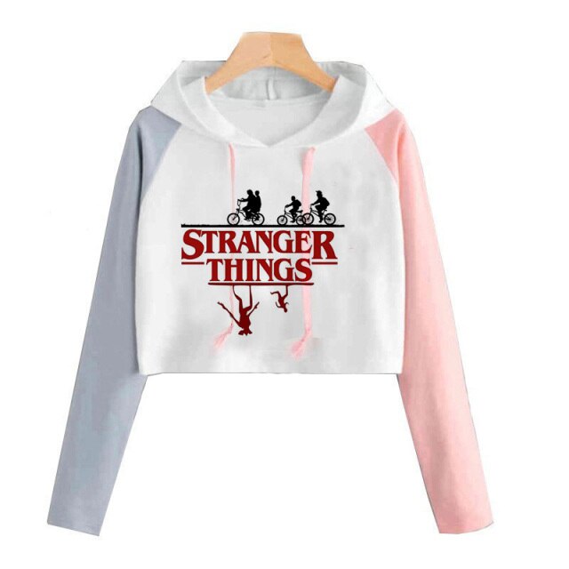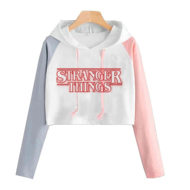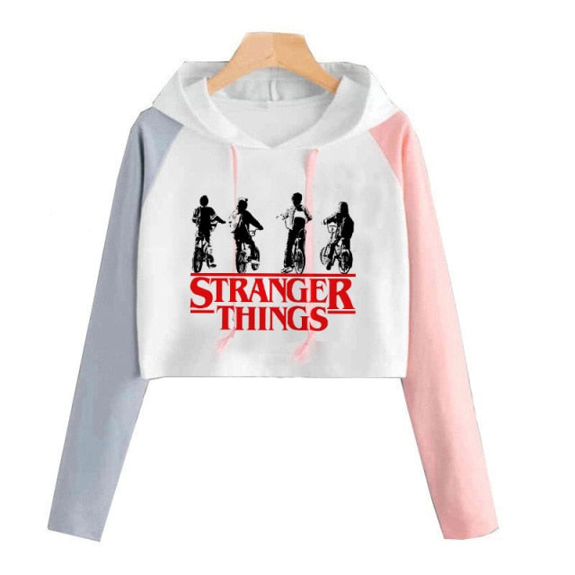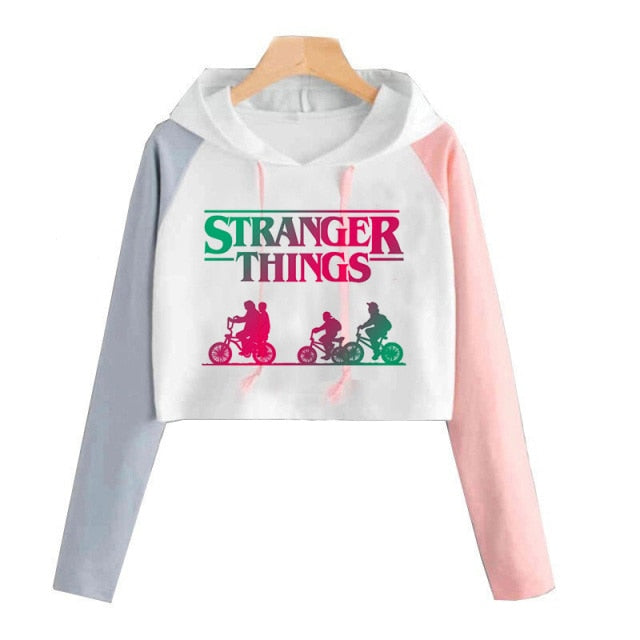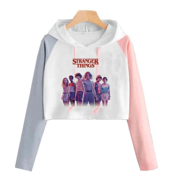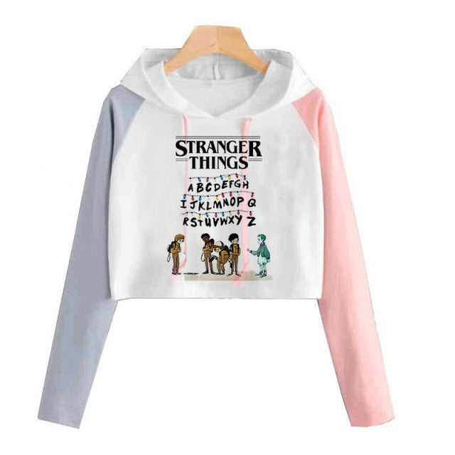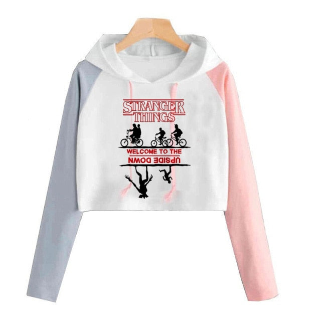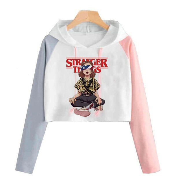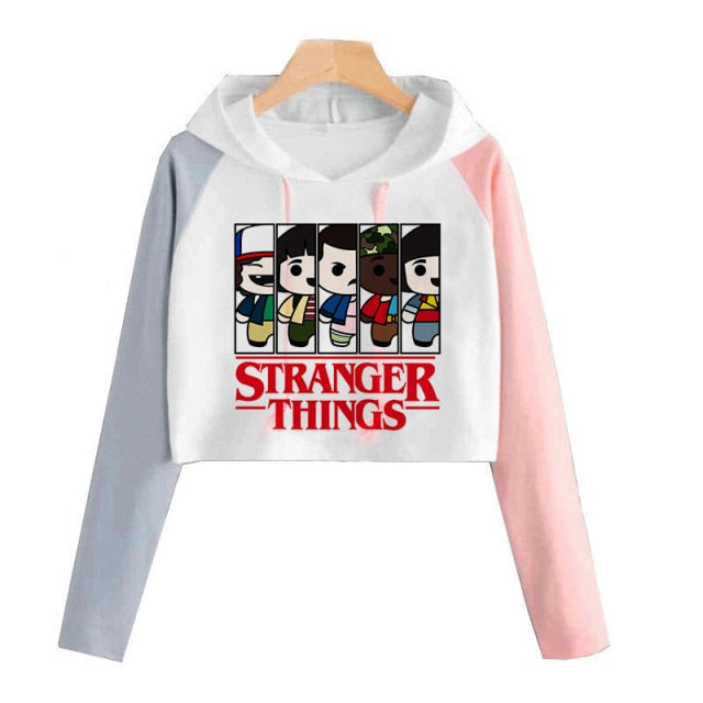 Roztomilá mikina v croptop střihu a potiskem seriálu Stranger Things s dvoubarevnými rukávy a kapucí.