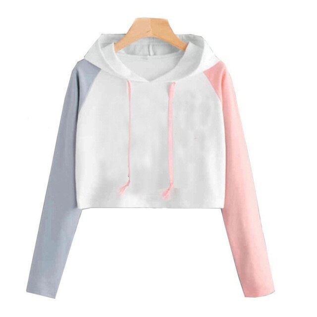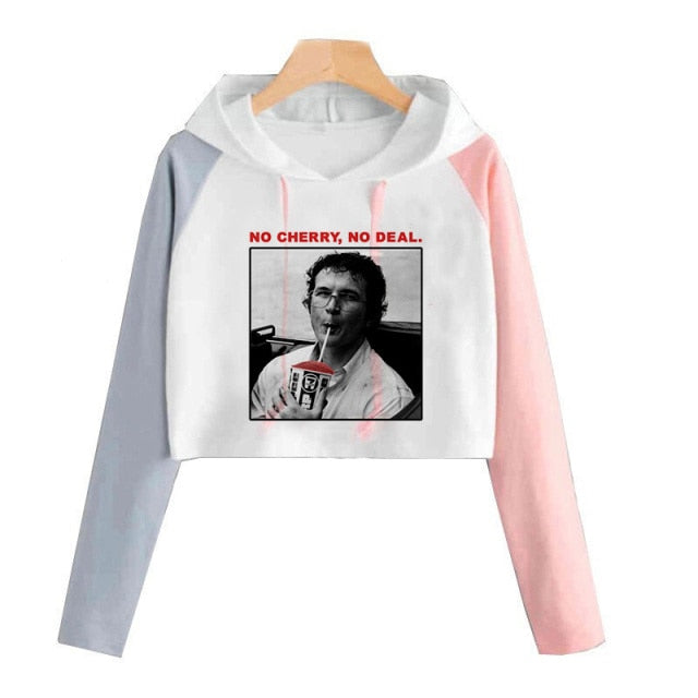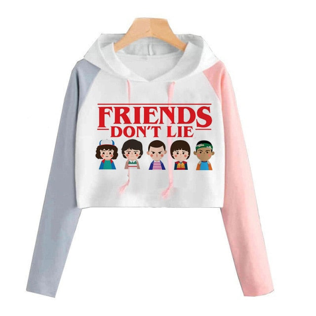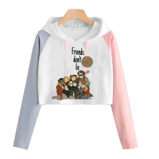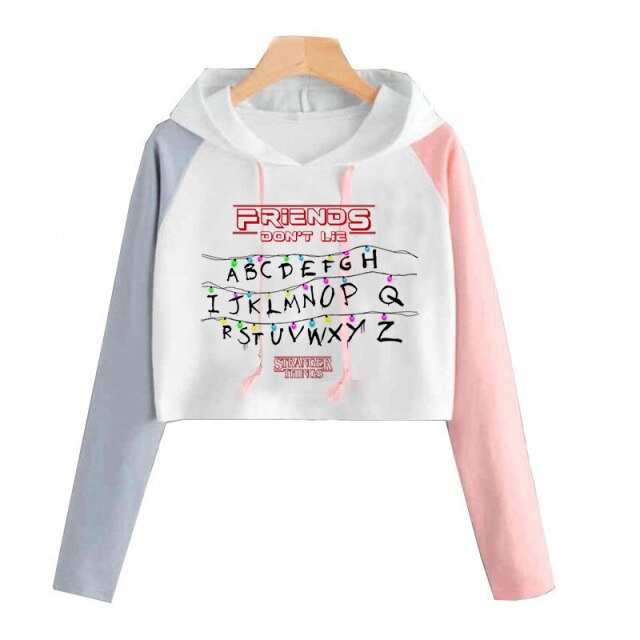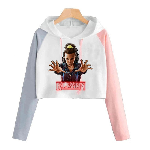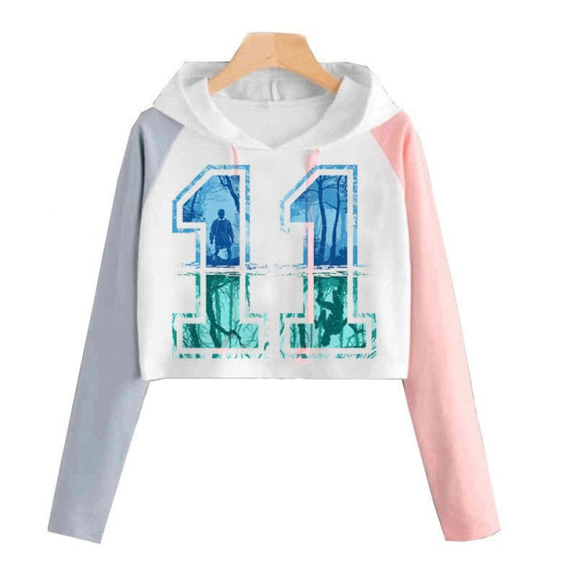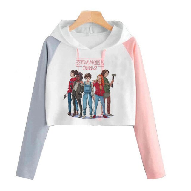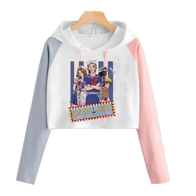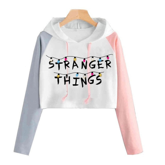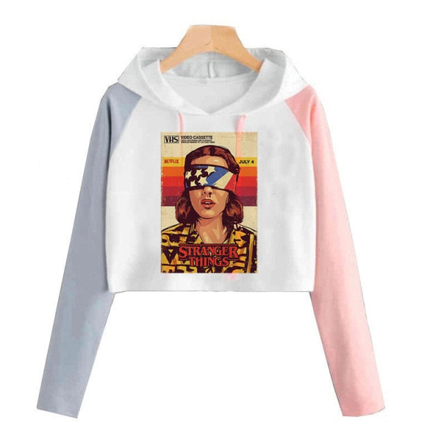 Roztomilá mikina v croptop střihu a potiskem seriálu Stranger Things s dvoubarevnými rukávy a kapucí.