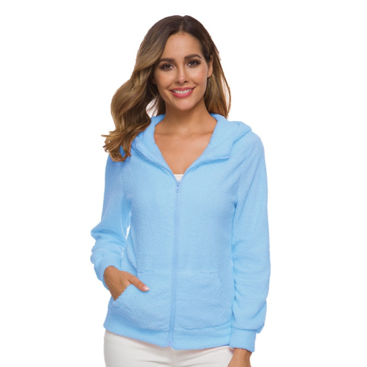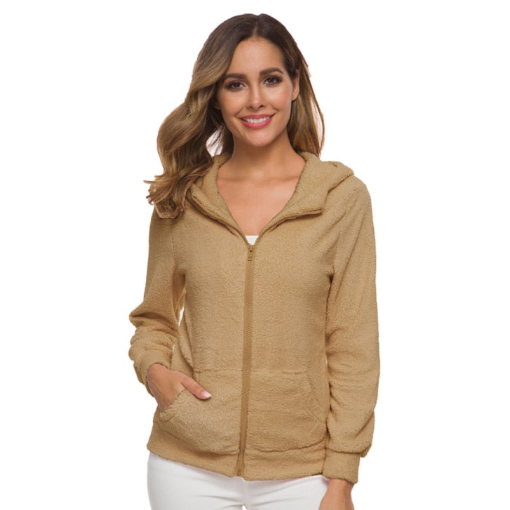 Dámská stylová jednoduchá teplá chlupatá mikina s kapucí. Více barev na výběr.