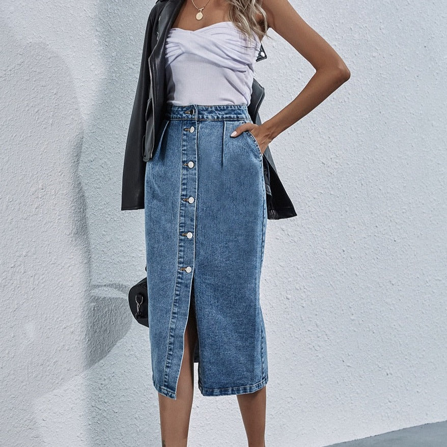Dámská stylová vintage džínová dlouhá sukně s knoflíky ve stříbrné barvě.