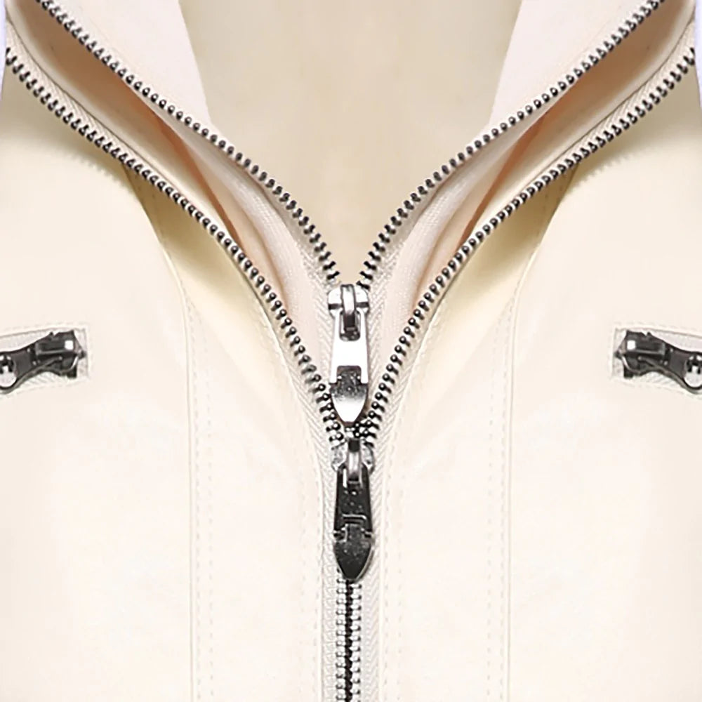 Dámská koženková bunda s mikinovým vnitřkem a kapucí v různých barvách a kapsách.