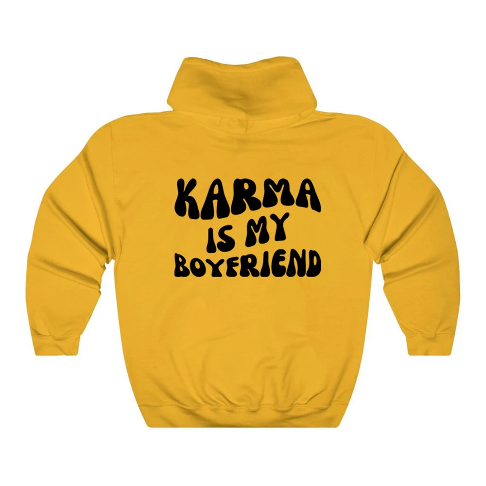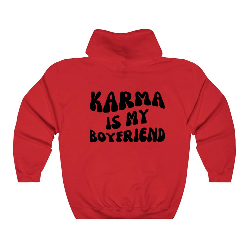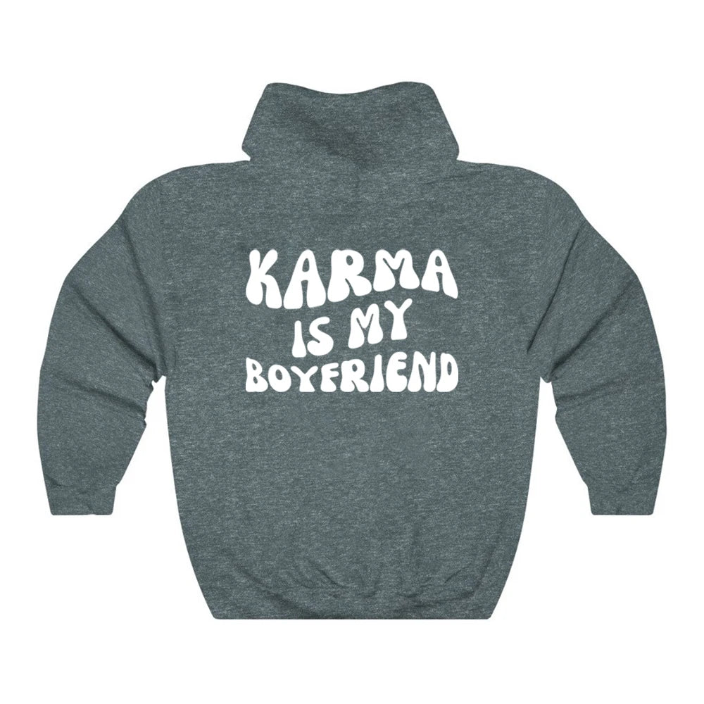 Dámská stylová mikina s nápisem Karma Is My Boyfriend a kapucí. Více barev na výběr.