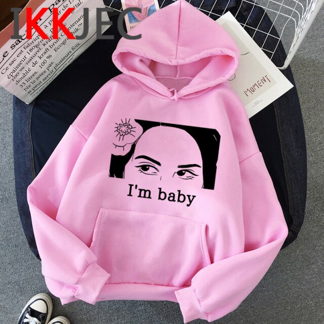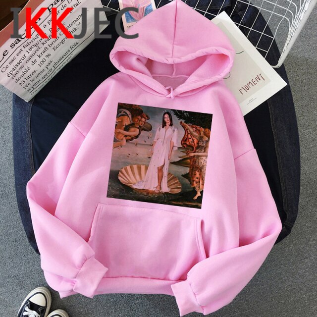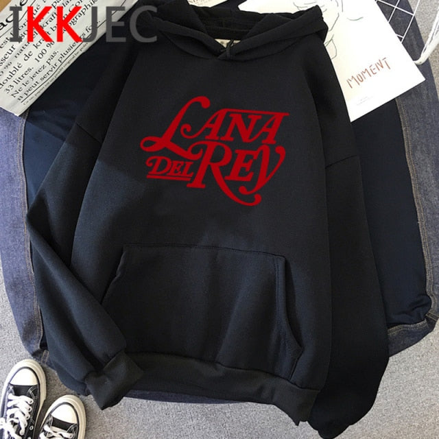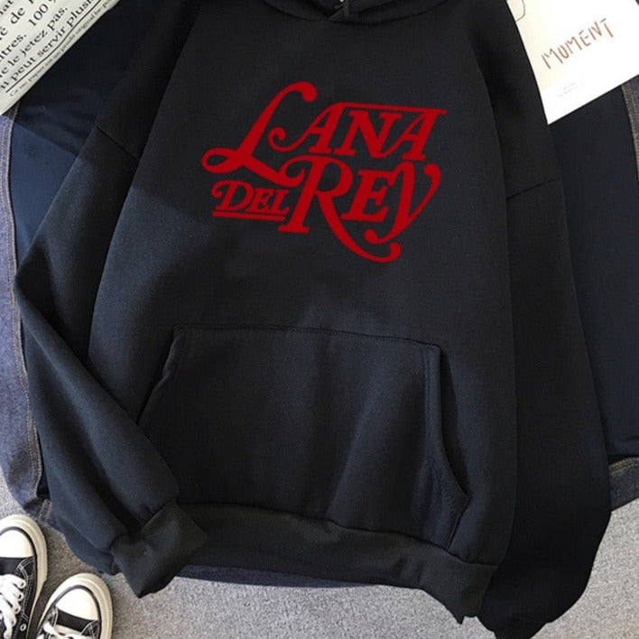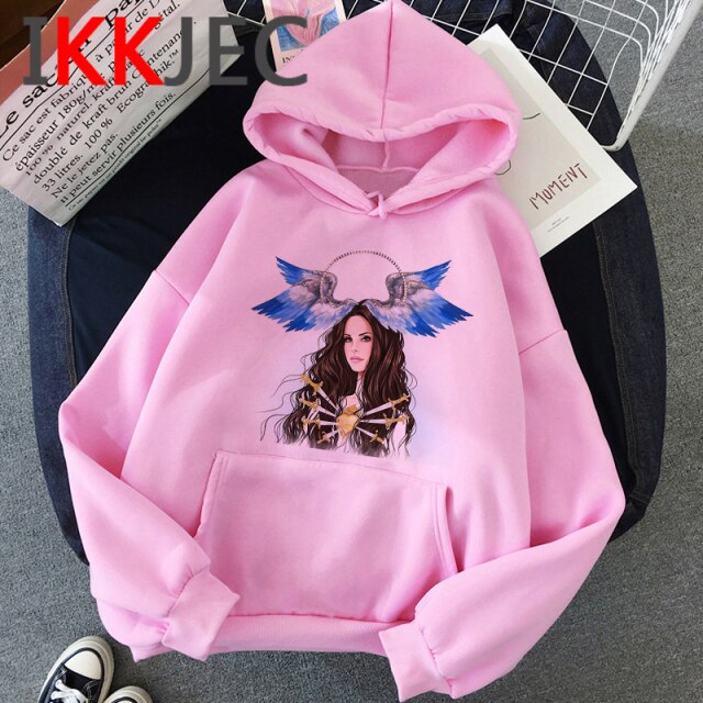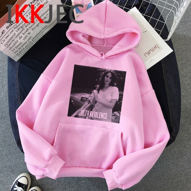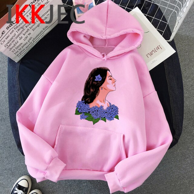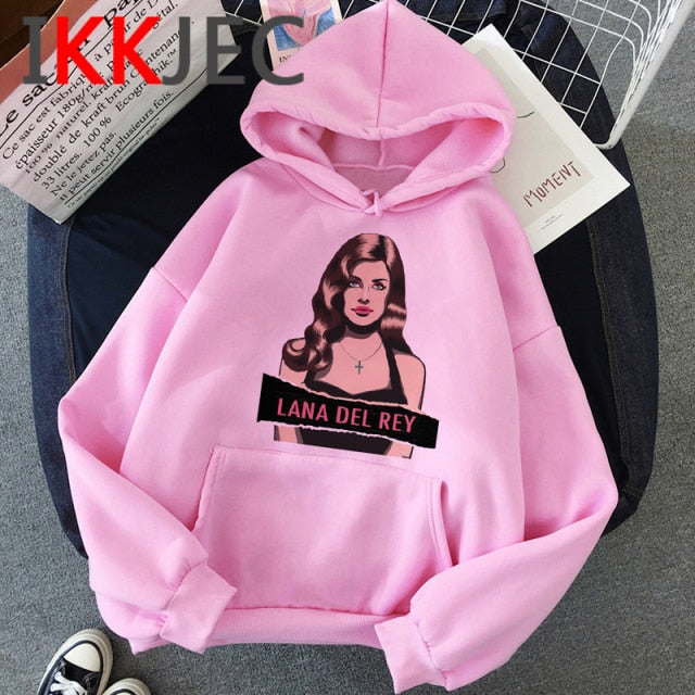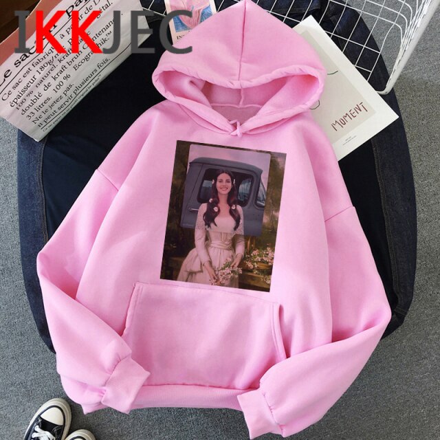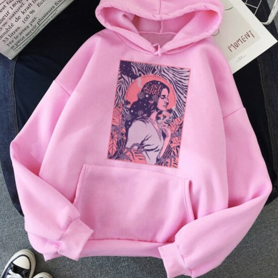 Dámská mikina s kapucí a potiskem Lany del Rey v černé a růžové barevné variantě.