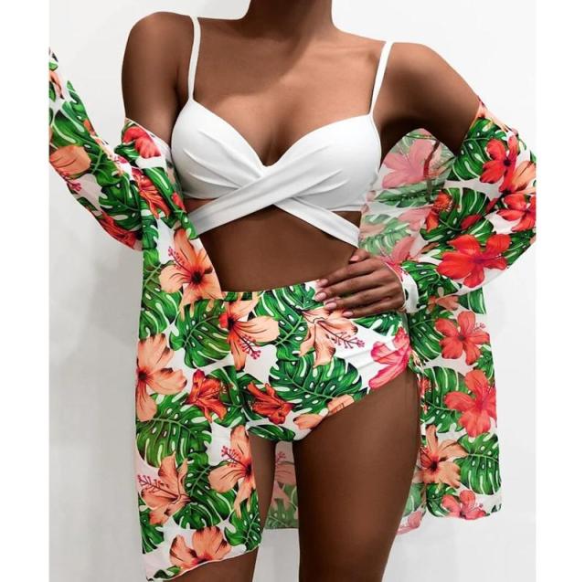 Dámské stylové dvoudílné plavky s bílým vrškem a různobarevným spodkem. Spolu s bikinama je v balení i různobarevný přehoz, který ladí se spodkem plavek.