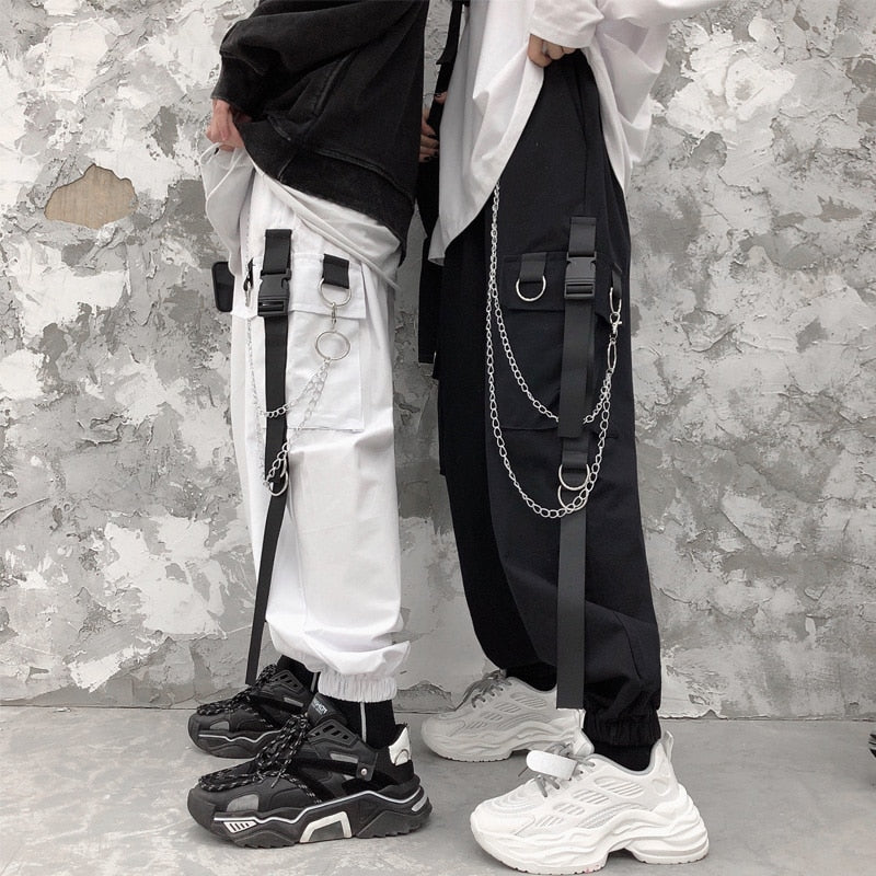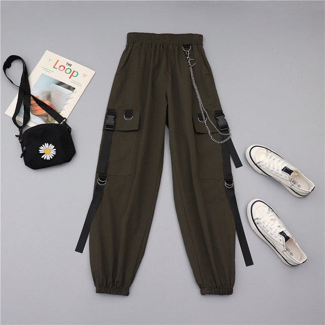 Dámské cargo stylové dlouhé kalhoty s kapsami a stříbrným řetězem. Více barev na výběr.
