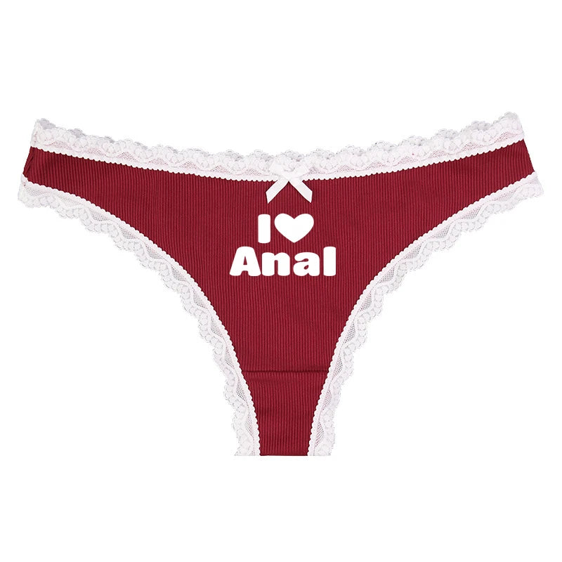 Dámské tanga kalhotky s nápisem I love anal a mašličkou.