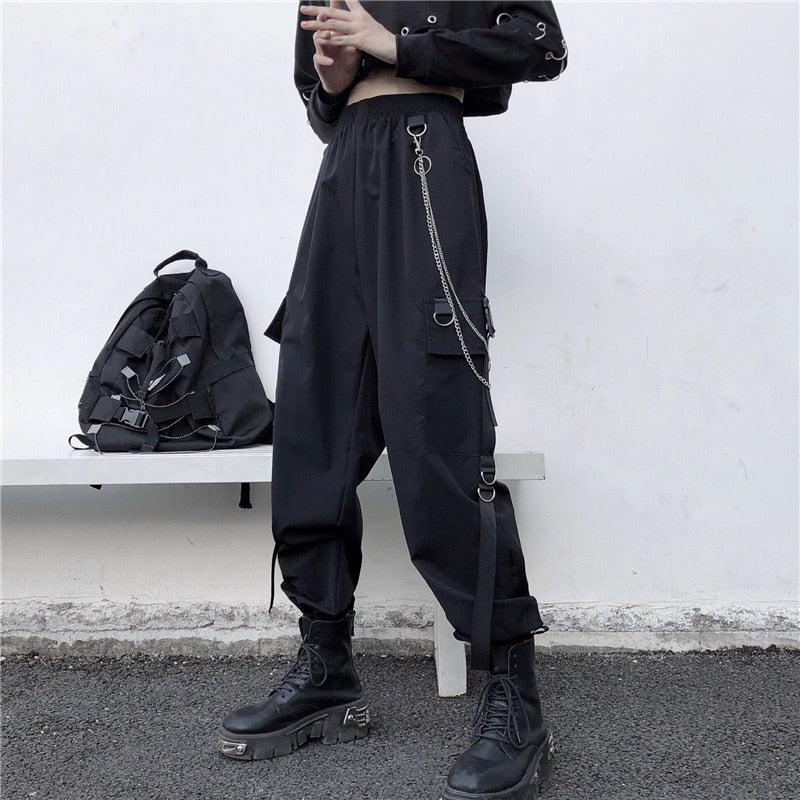 Dámské stylové kalhoty s řetězem a kapsami. Vhodné na každodenní nošení.