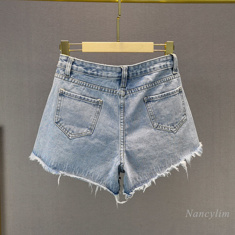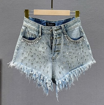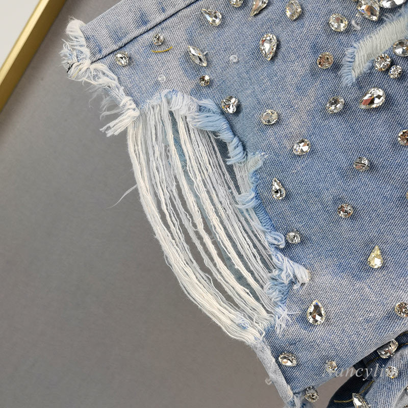 Dámské stylové roztrhané kraťasy s kamínky na přední straně.