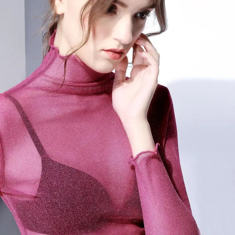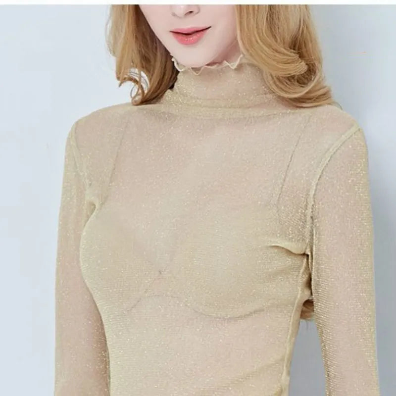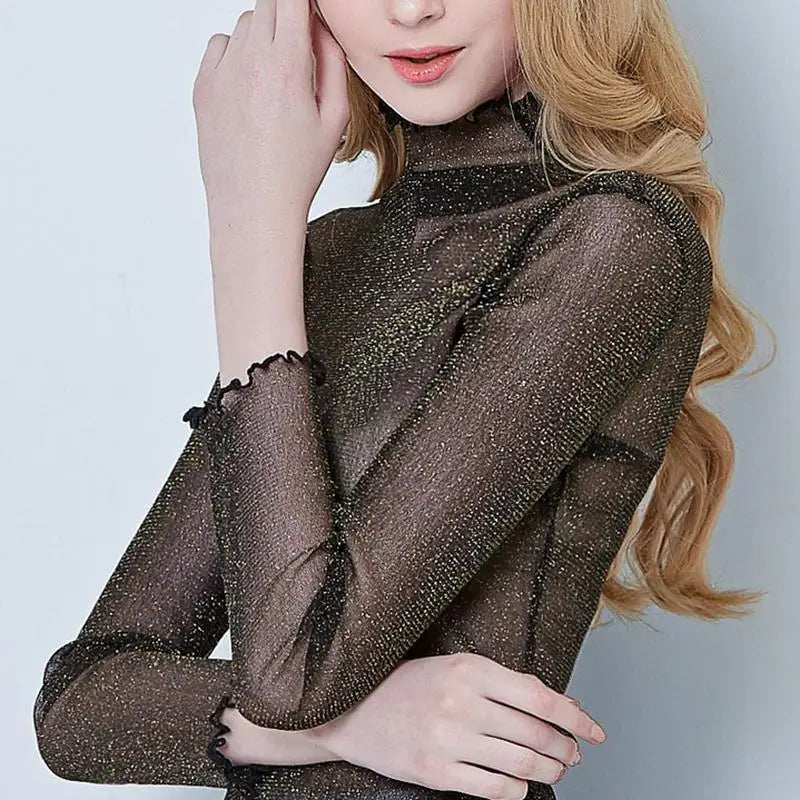 Dámské stylové průhledné třpytivé triko s dlouhým rukávem a roláčkem. Více barev na výběr.
