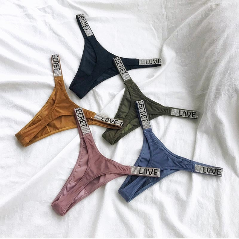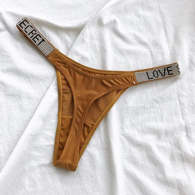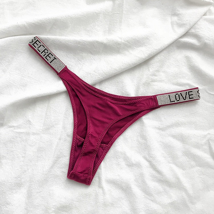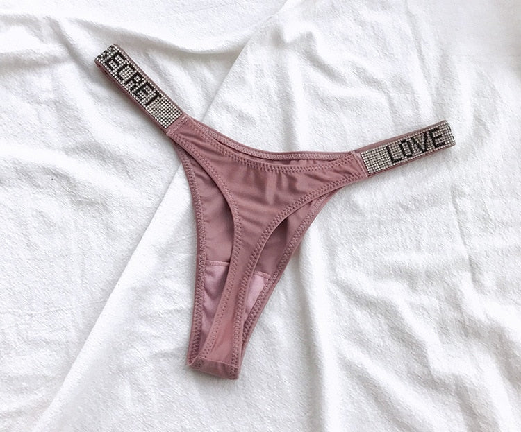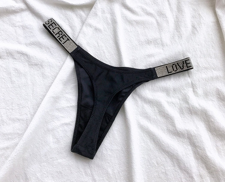 Dámské elegantní tanga s kamínky na stranách a nápisem.