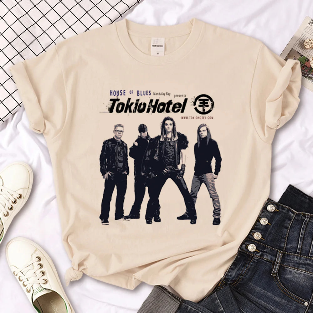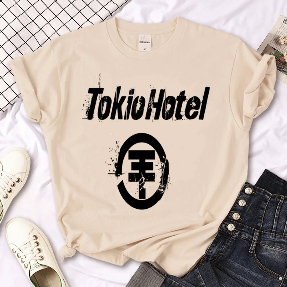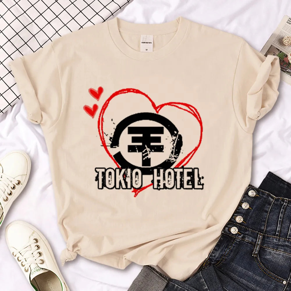Dámské stylové triko s potiskem Tokio Hotel a krátkým rukávem.