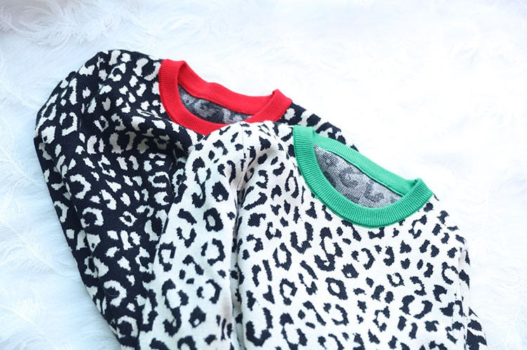 Dámský originální svetr s leopardím potiskem, který je nabízen ve dvou barevných provedeních. Černý svetr s červeným detailem na výstřihu a béžový svetr se zeleným detailem na výstřihu.