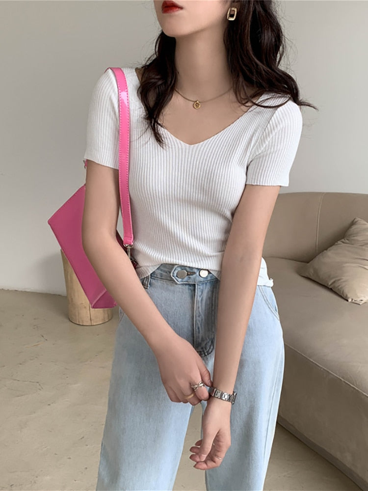 Dámský jednoduchý svetr s krátkým rukávem a výstřihem. Více barev na výběr.