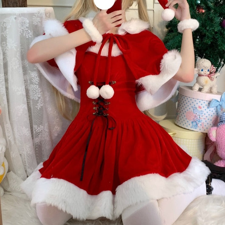 Dámský sexy vánoční kostým, který obsahuje šaty, čepici a bolerko.