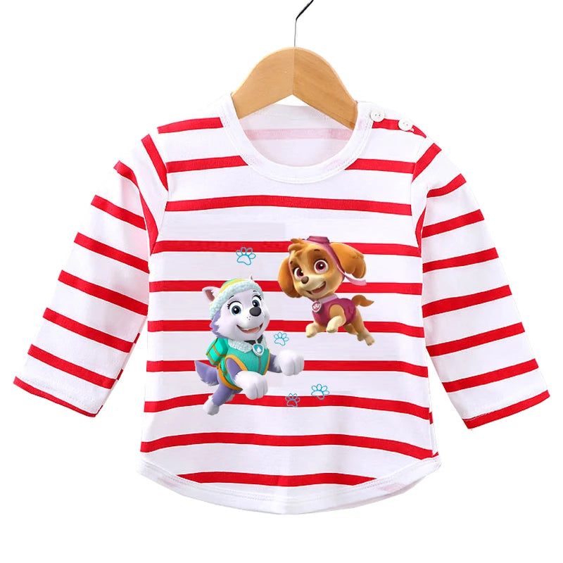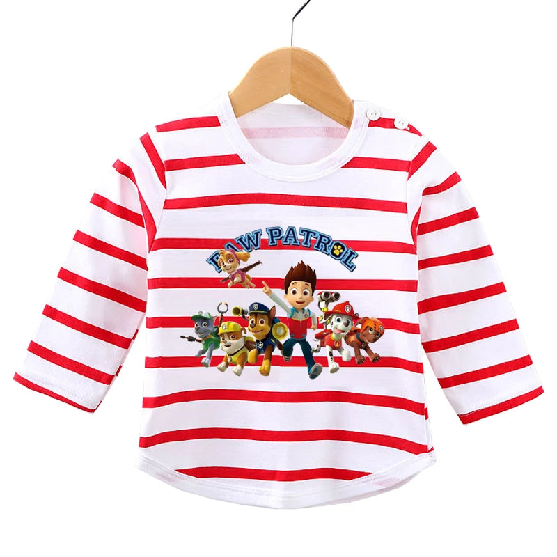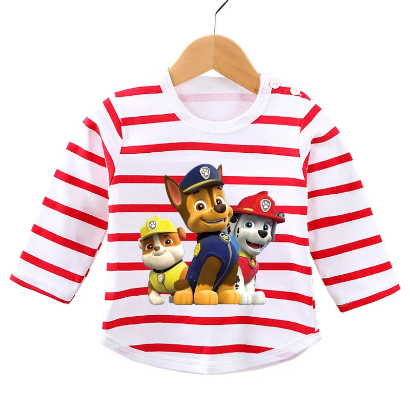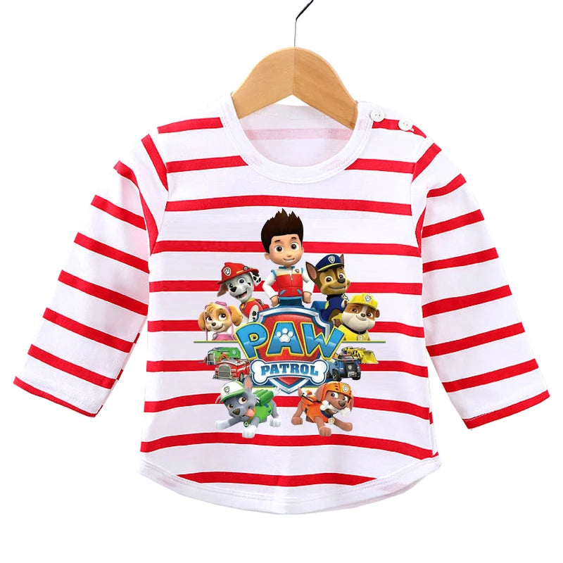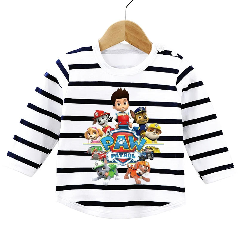 Dětské roztomilé triko s potiskem Tlapková patrola s pruhy a dlouhým rukávem.