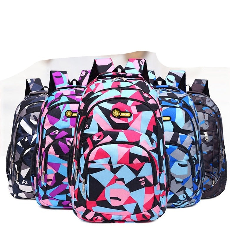 Stylový a originální batoh v různých barevných variantách v geometrickém potisku. Je velmi praktický a pohodlný pro každodenní nošení školních učebnic a pomůcek.