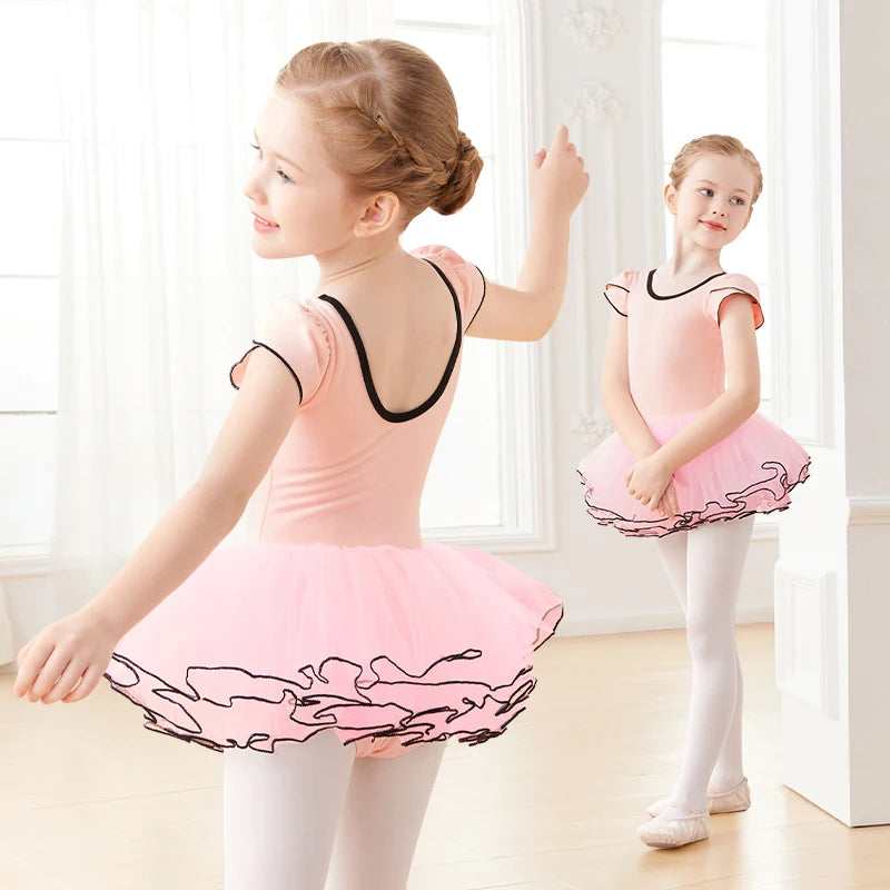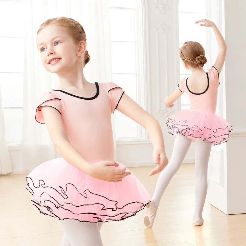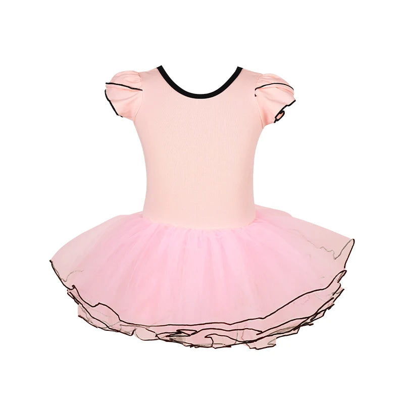 Dívčí roztomilý baletní trikot s tutu sukní v růžové barvě s černým detailem.