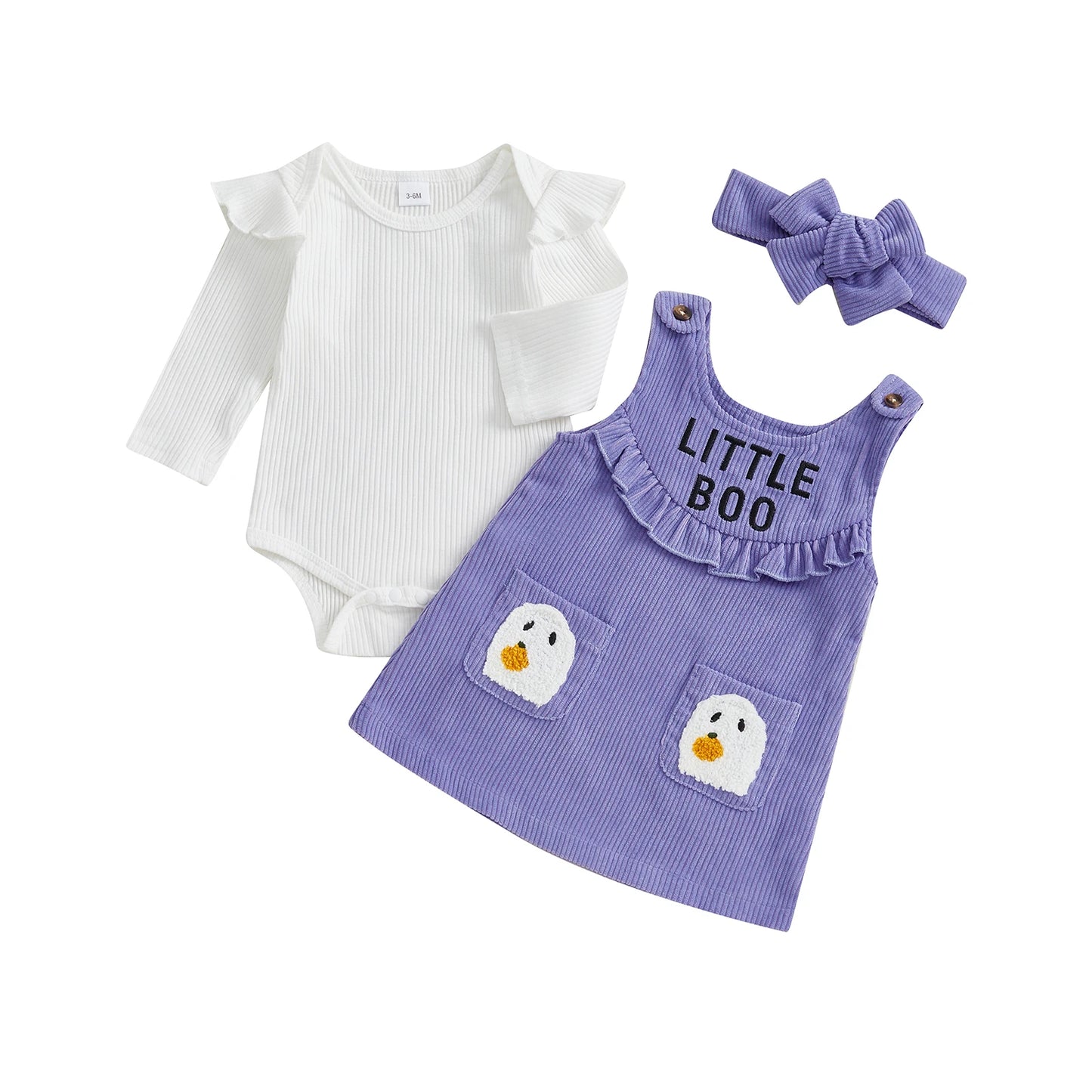 Dívčí halloweenský outfit v oranžové nebo fialové barvě s nápisem Little Boo.