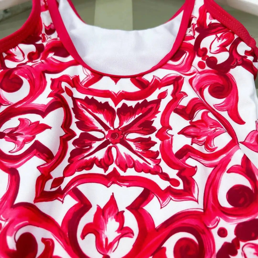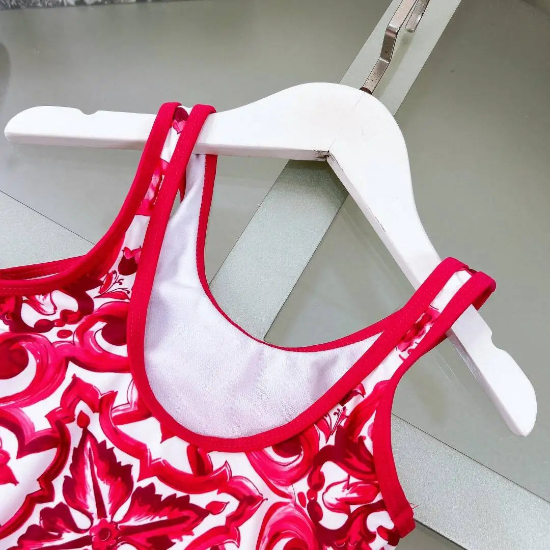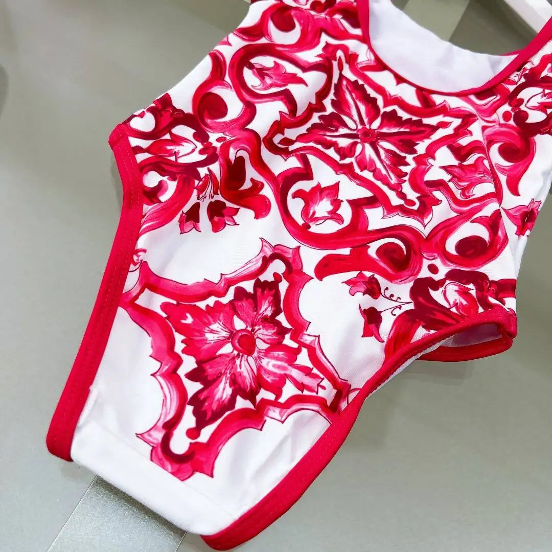 Dívčí pohodlné jednodílné plavky s růžovým vzorem.