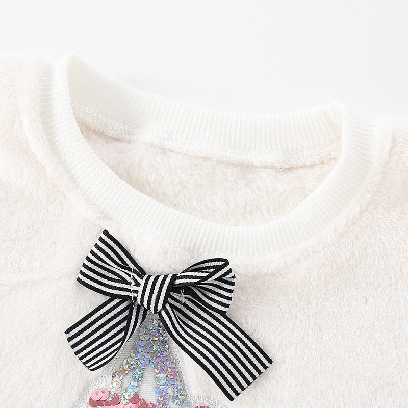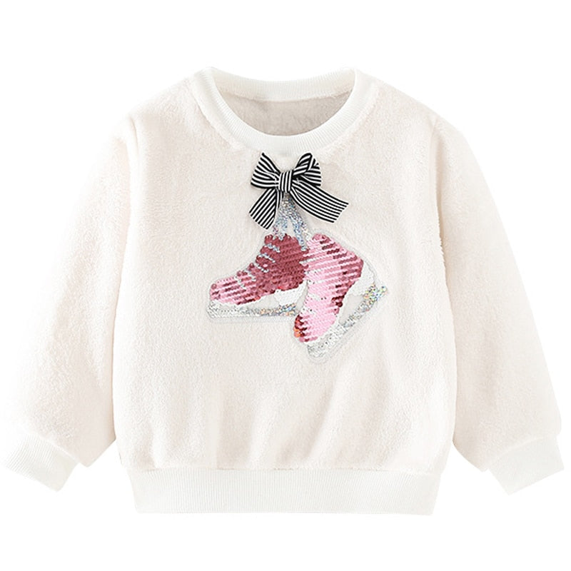 Dívčí teplá mikina v bílé barvě s teniskami a flitry .