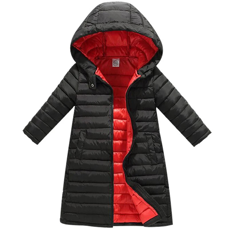 Dívčí dlouhá pohodlná péřová bunda s kapucí a kapsami. Více druhů na výběr.