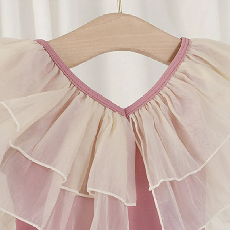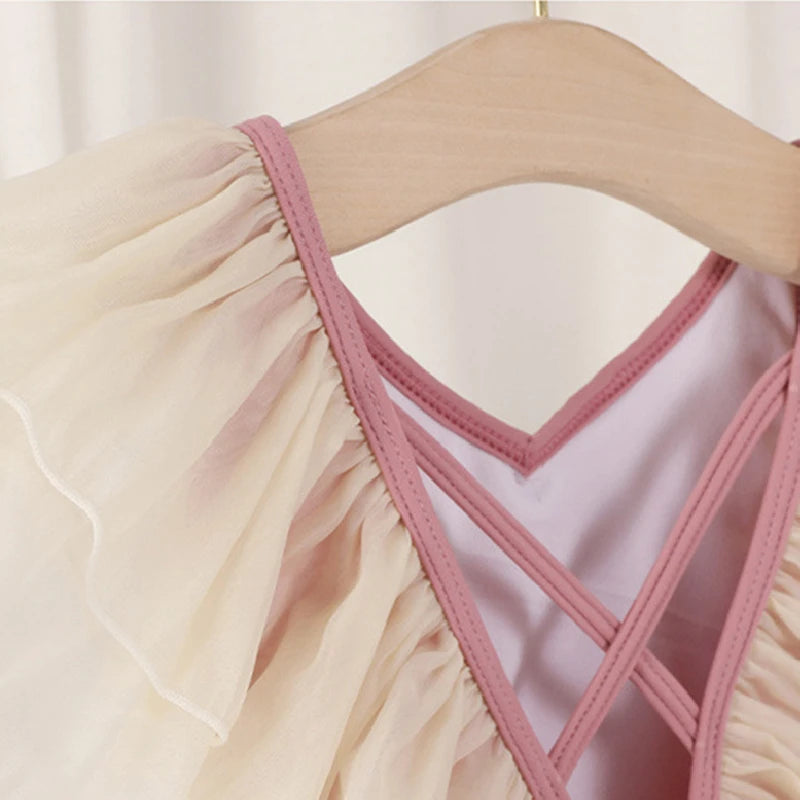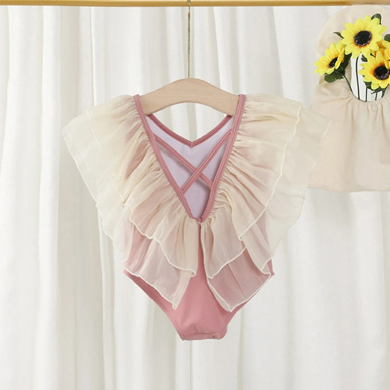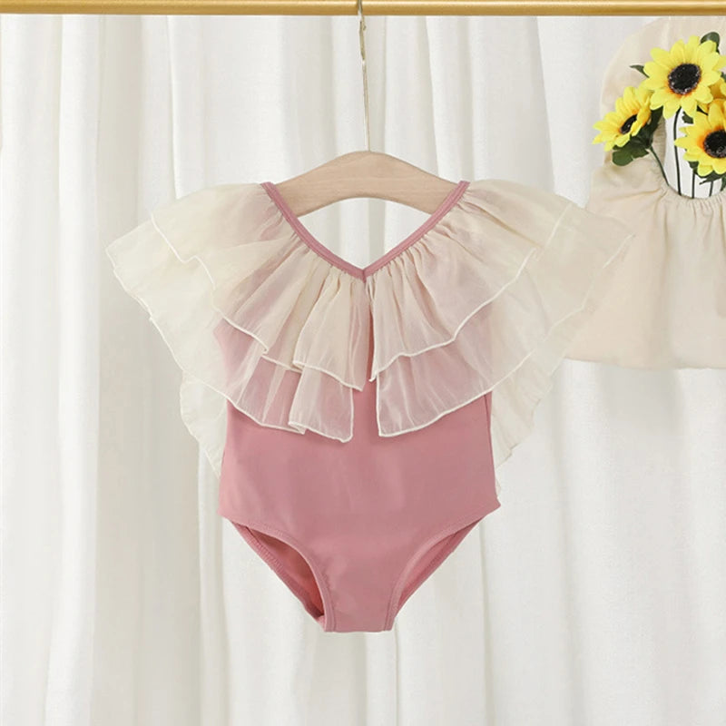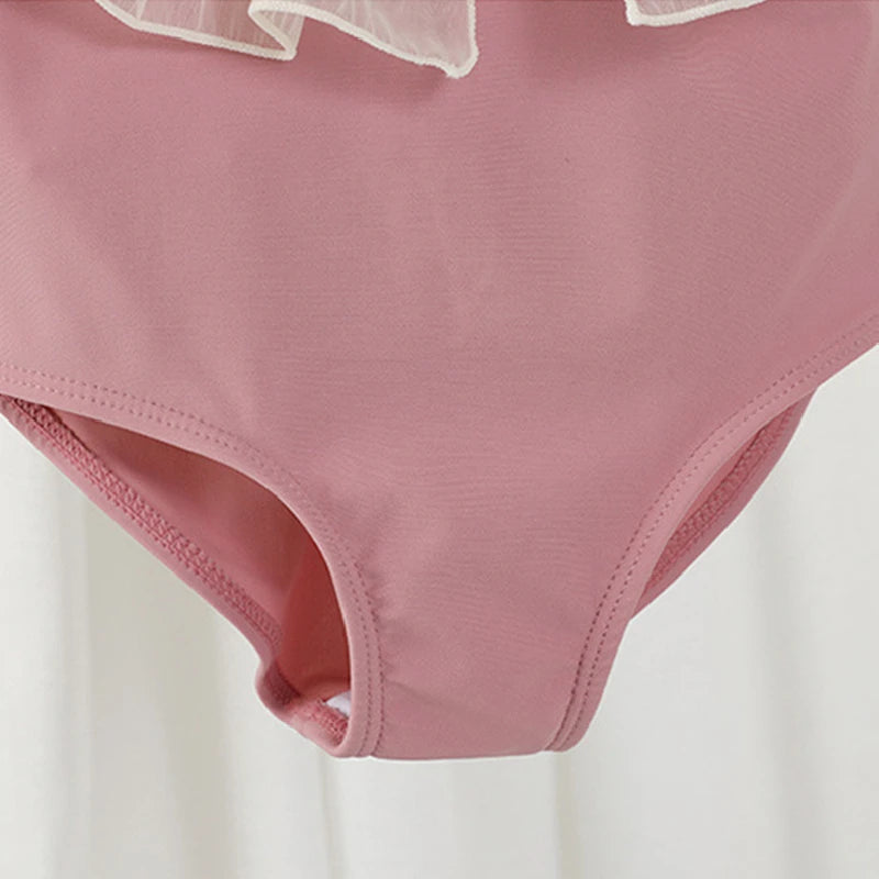 Dívčí roztomilé plavky pro batolata s volánky na ramenou.