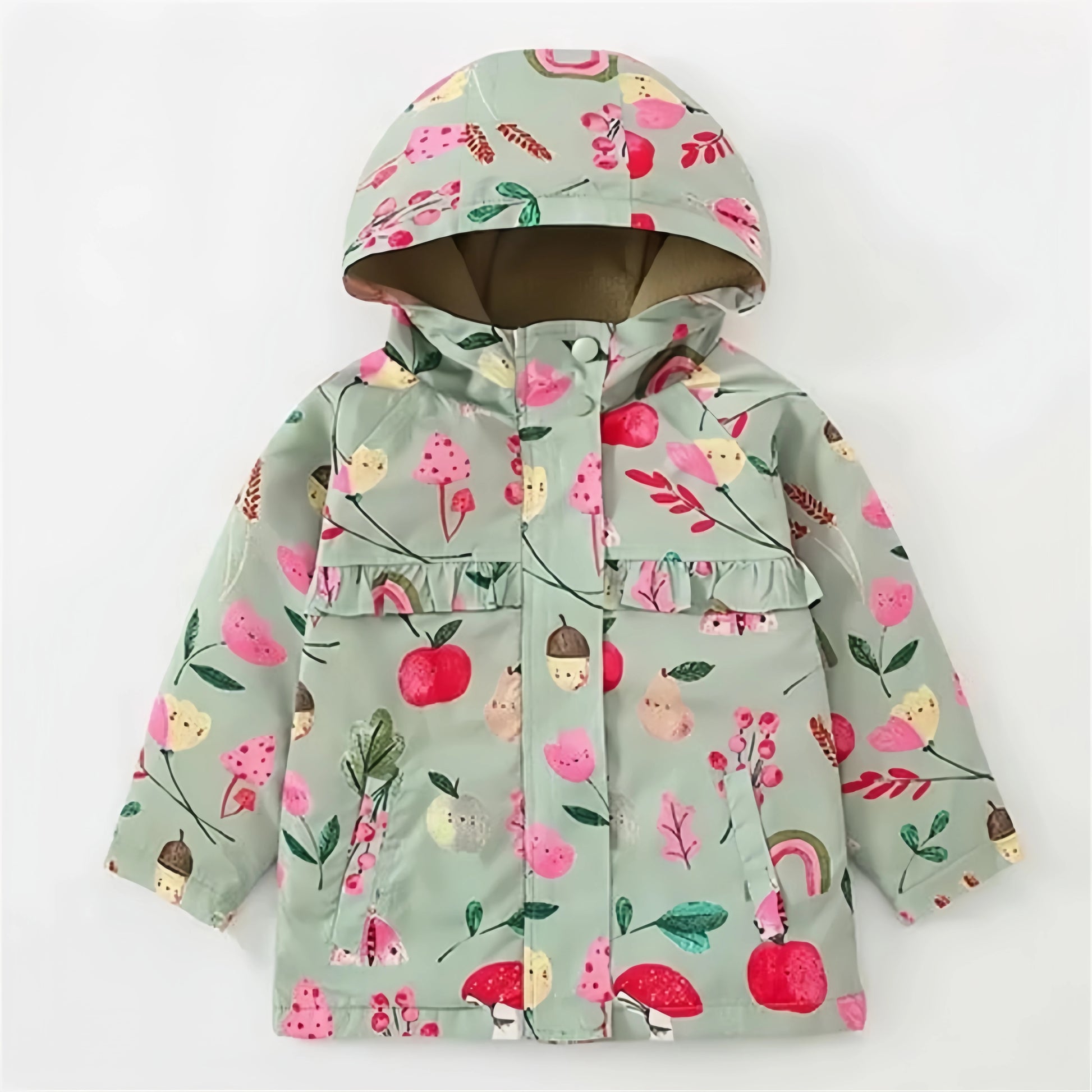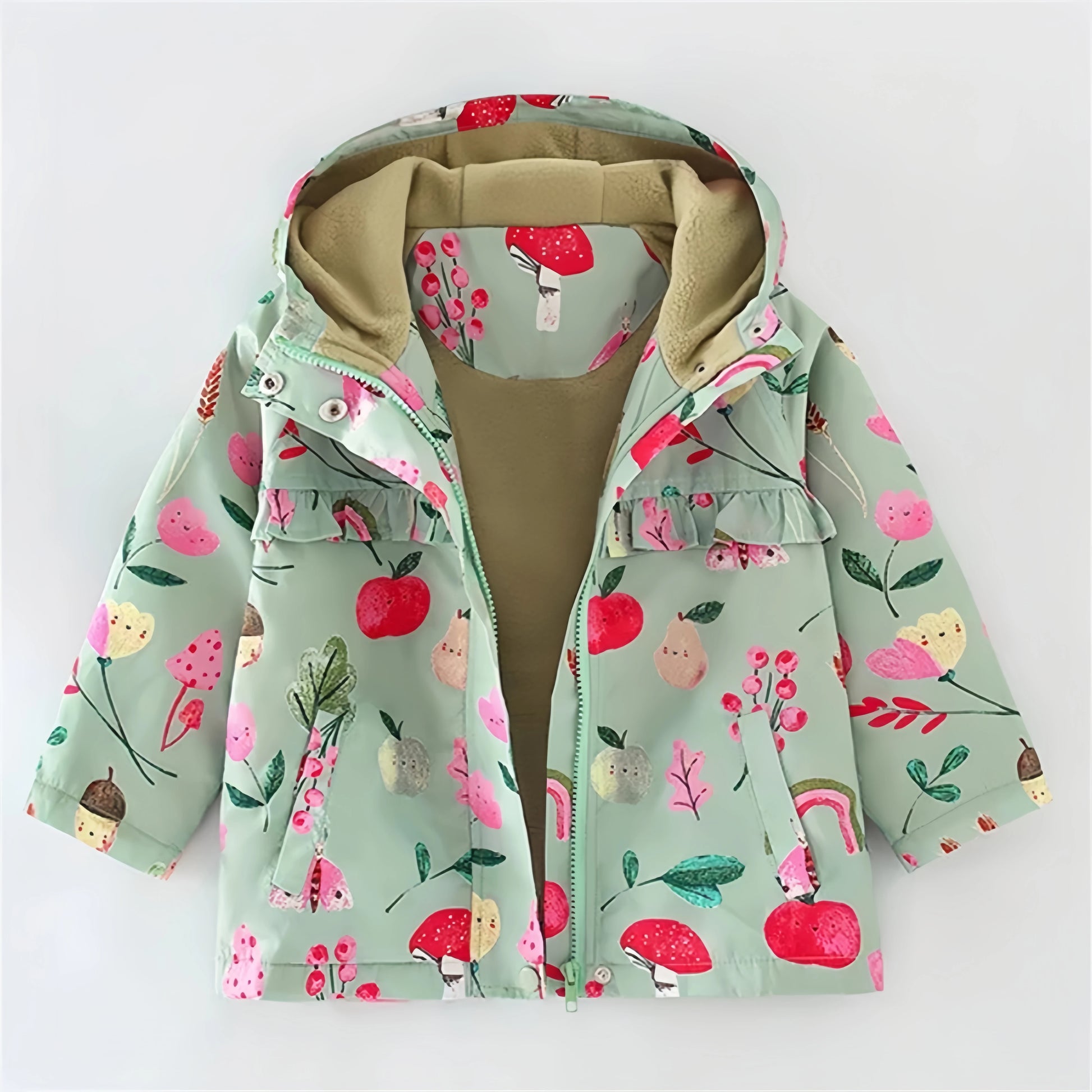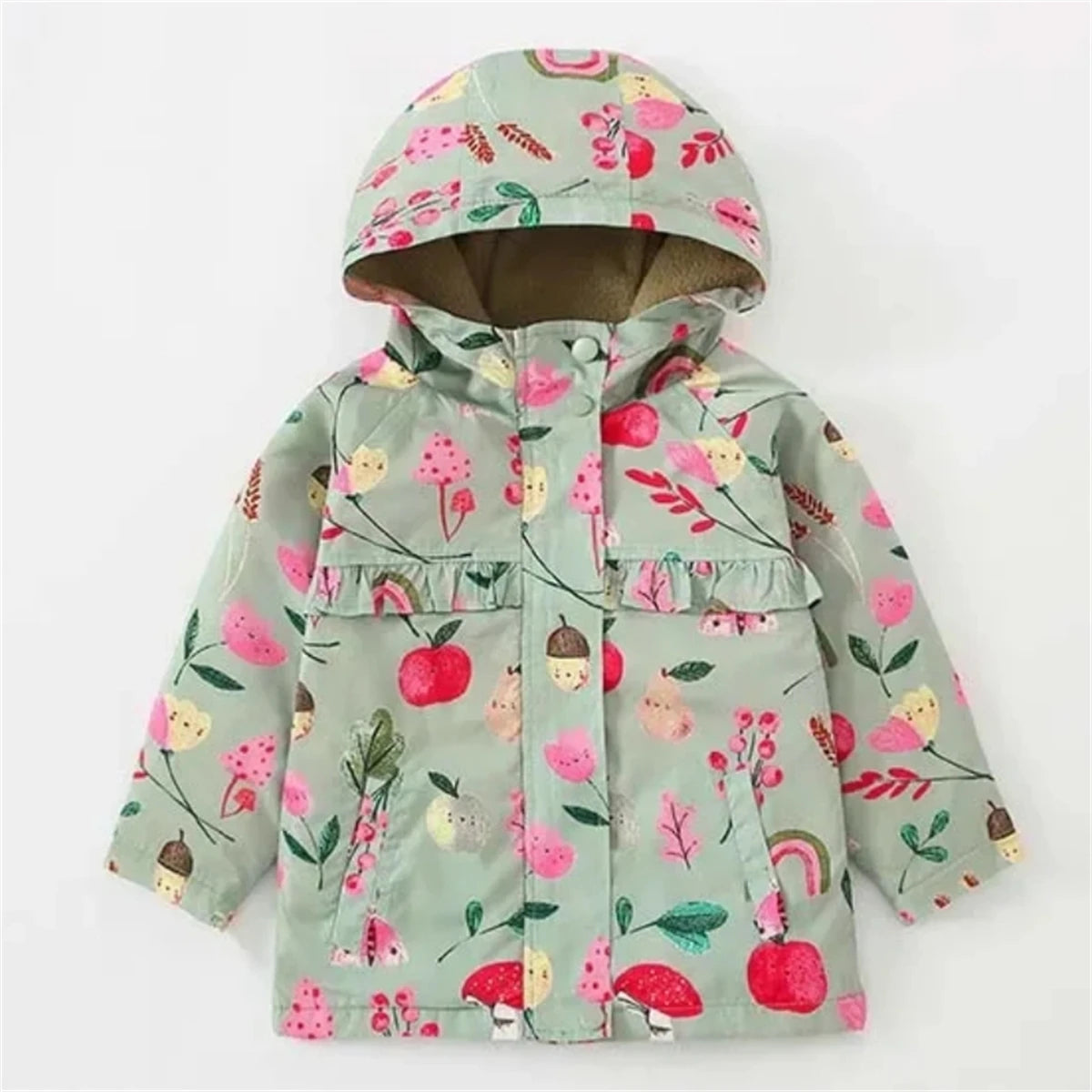 Dívčí podzimní bunda se vzorem rostlin a ovoce s kapucí.