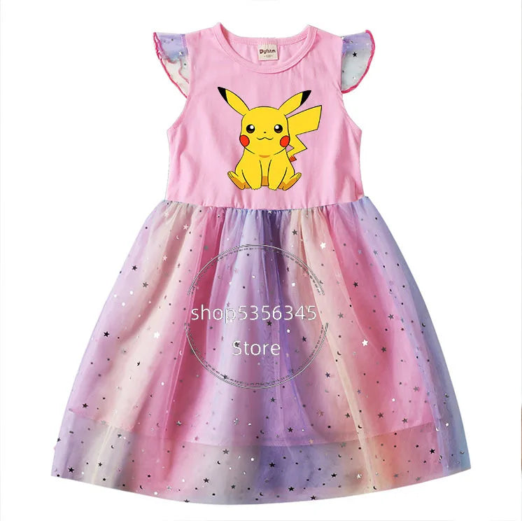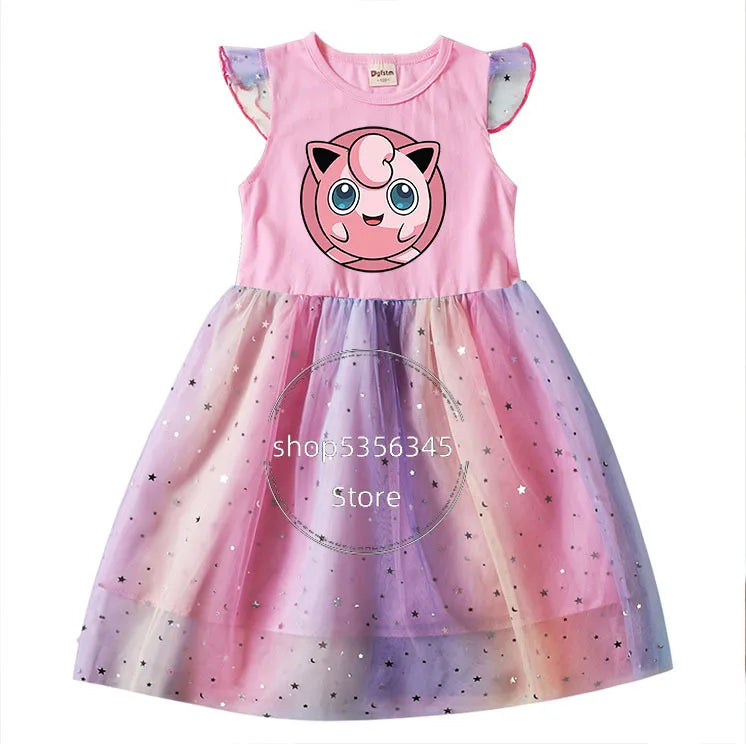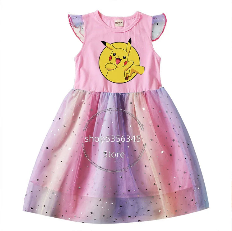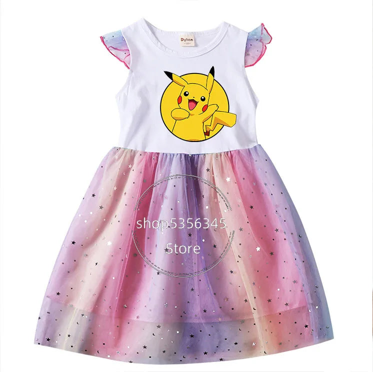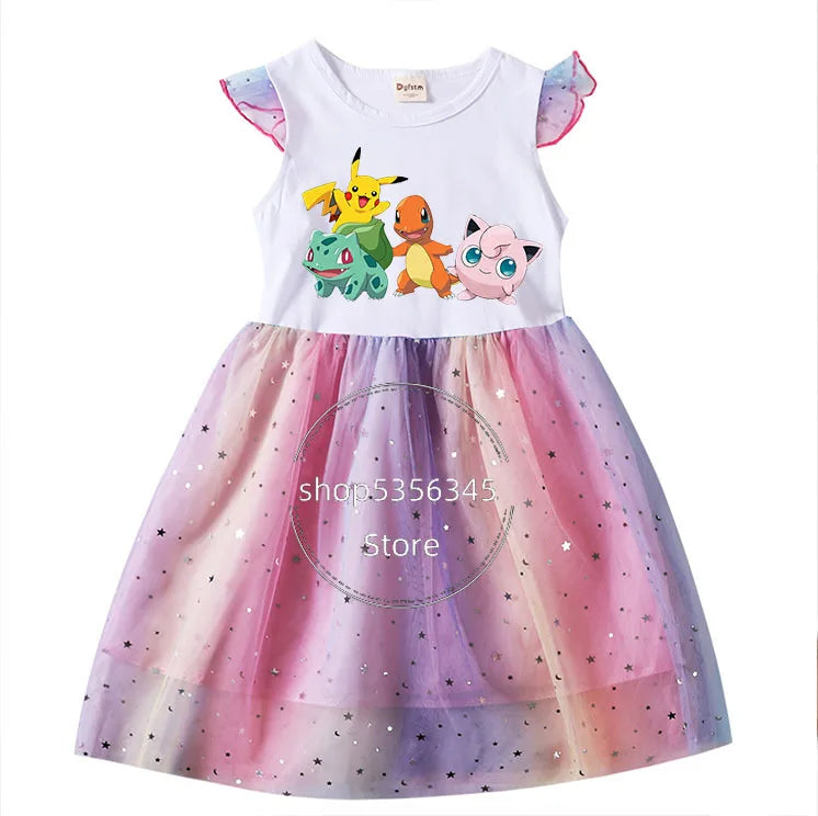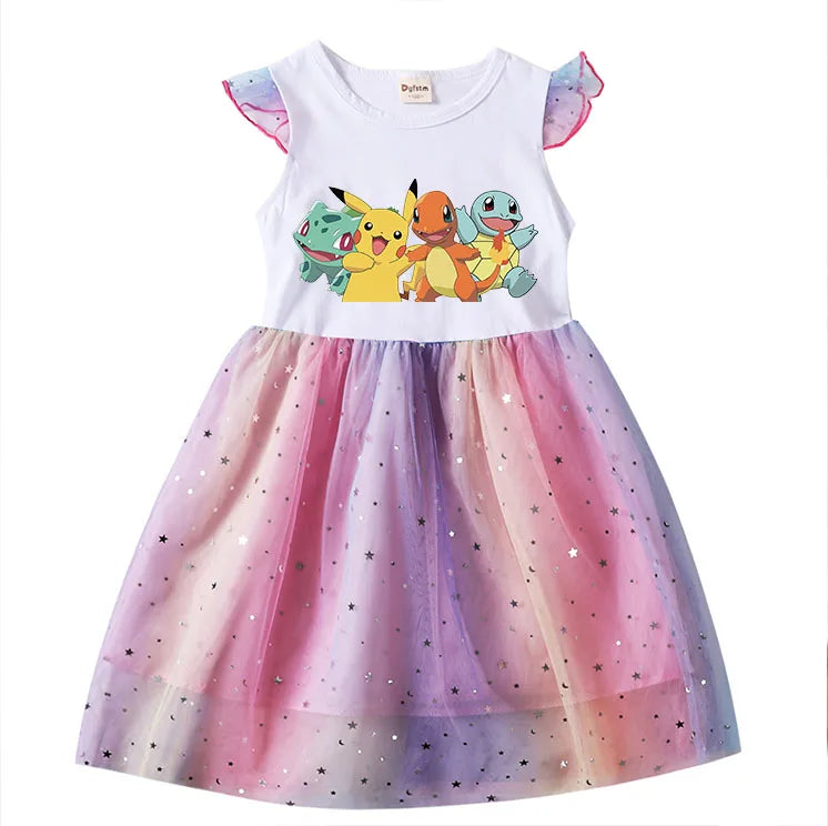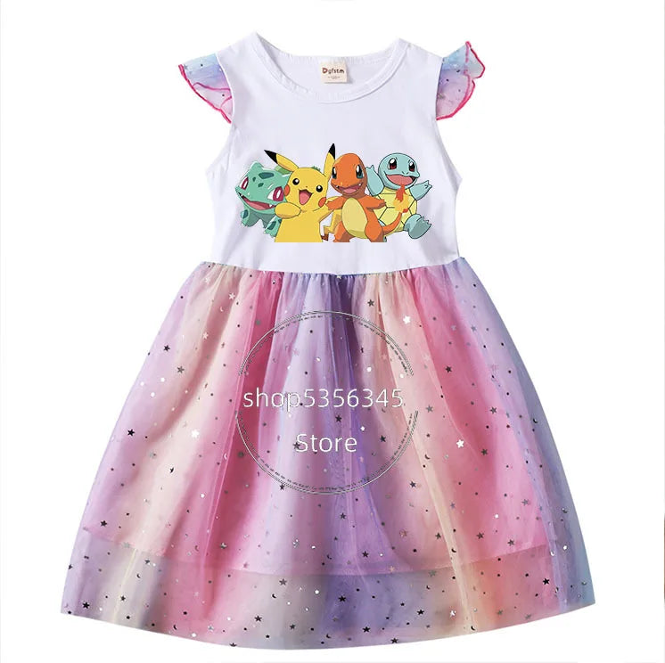 Dívčí šaty s potiskem Pokémon a krátkým rukávem s tutu sukní.