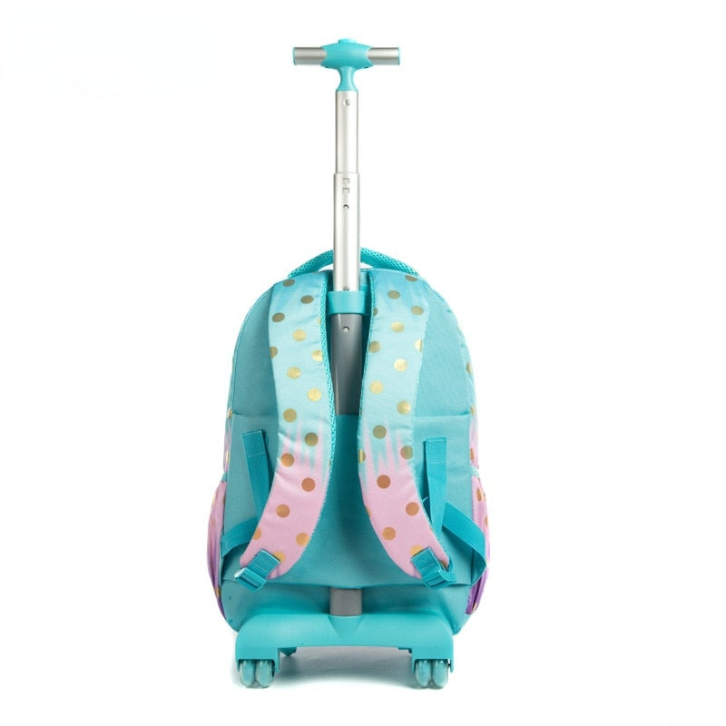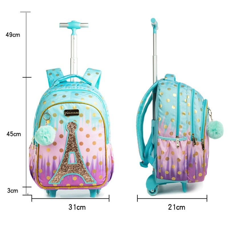 Dívčí pohodlný školní batoh na kolečkách s vyzobrazením Paříže. Set obsahuje batoh, penál a tašku.
