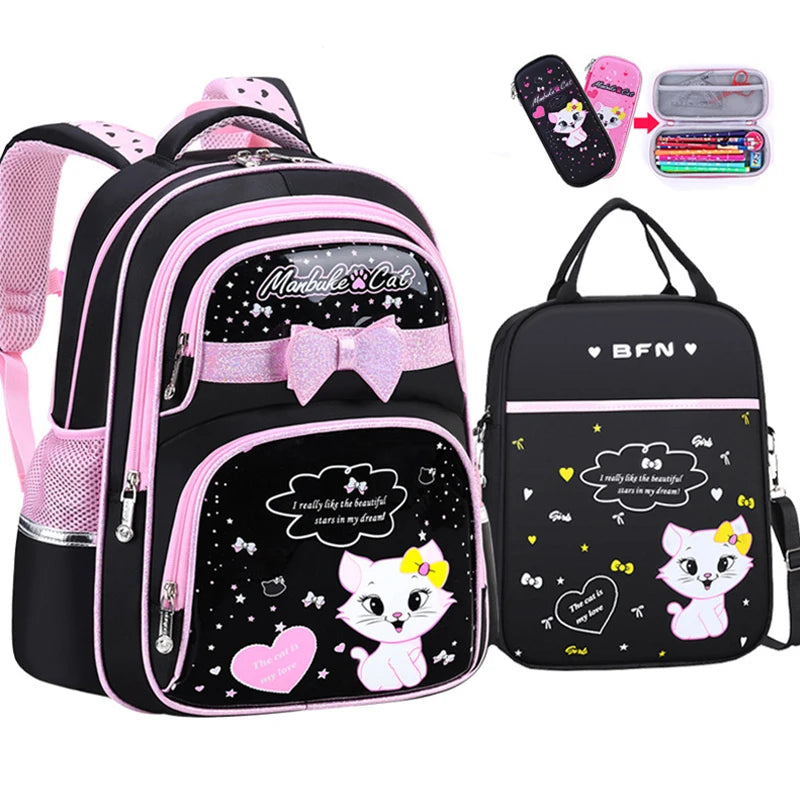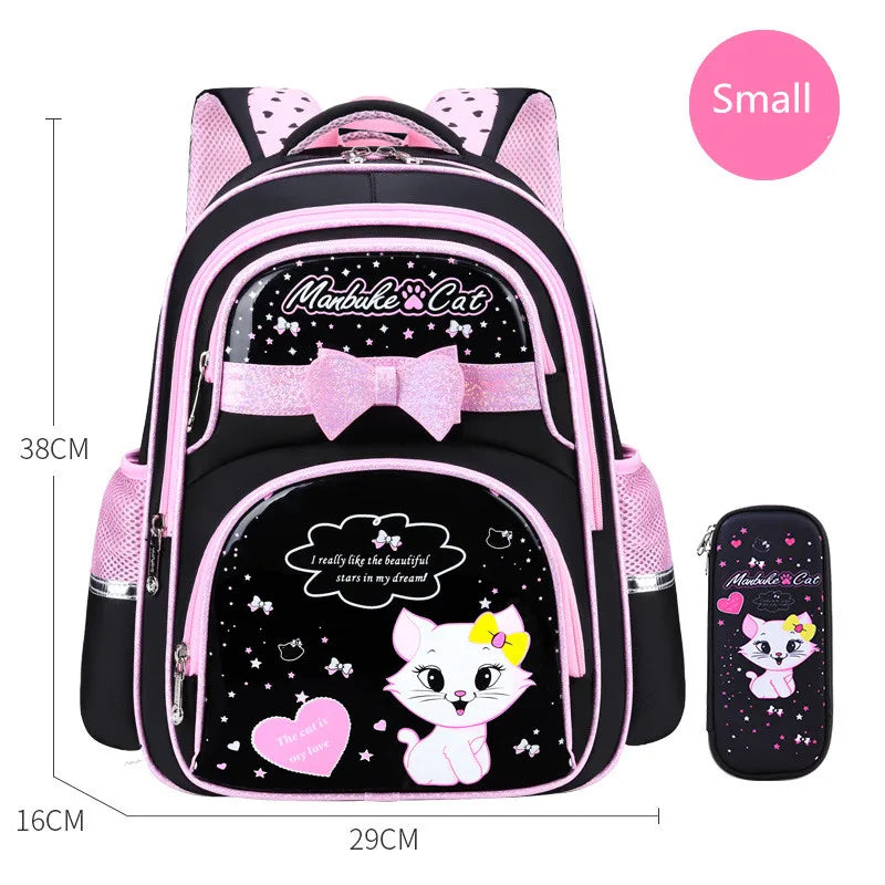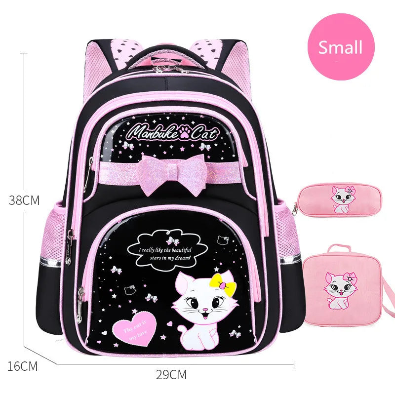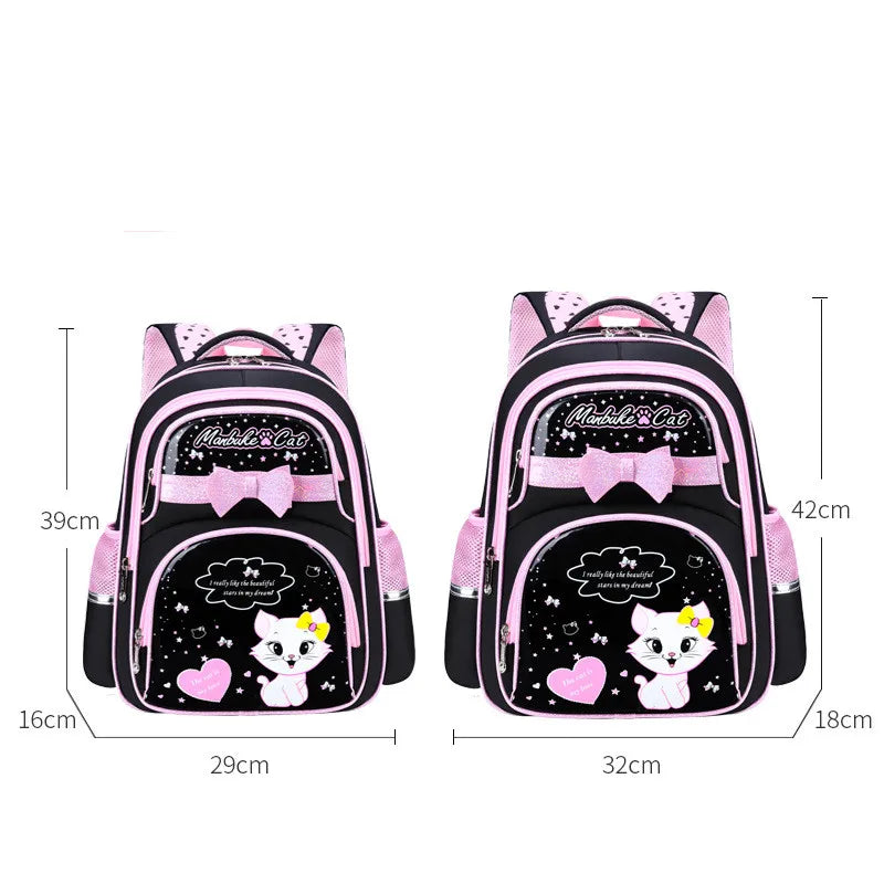 Dívčí roztomilý školní batoh s potiskem kočky a mašlí. Více stylů na výběr.