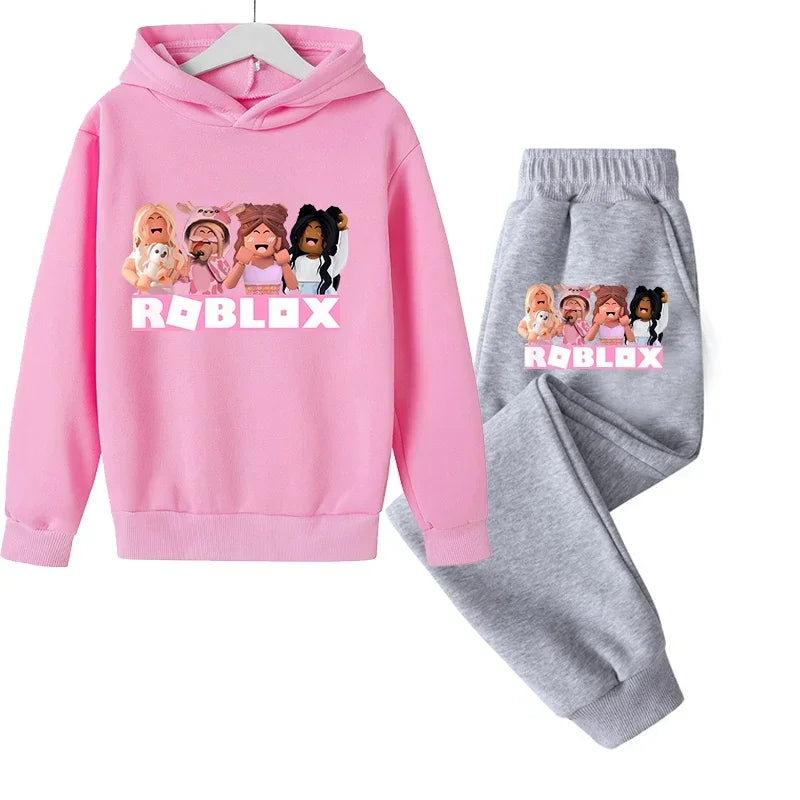 Dívčí pohodlná tepláková souprava s potiskem Roblox v růžové a šedé barvě.