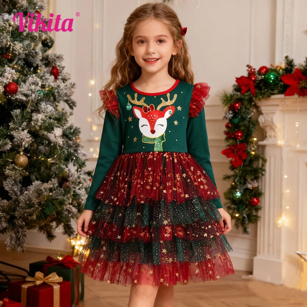 Dívčí roztomilé vánoční šaty se sobem s dlouhým rukávem. Více barev na výběr.