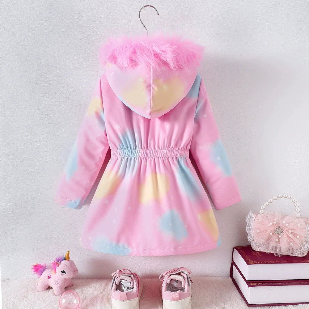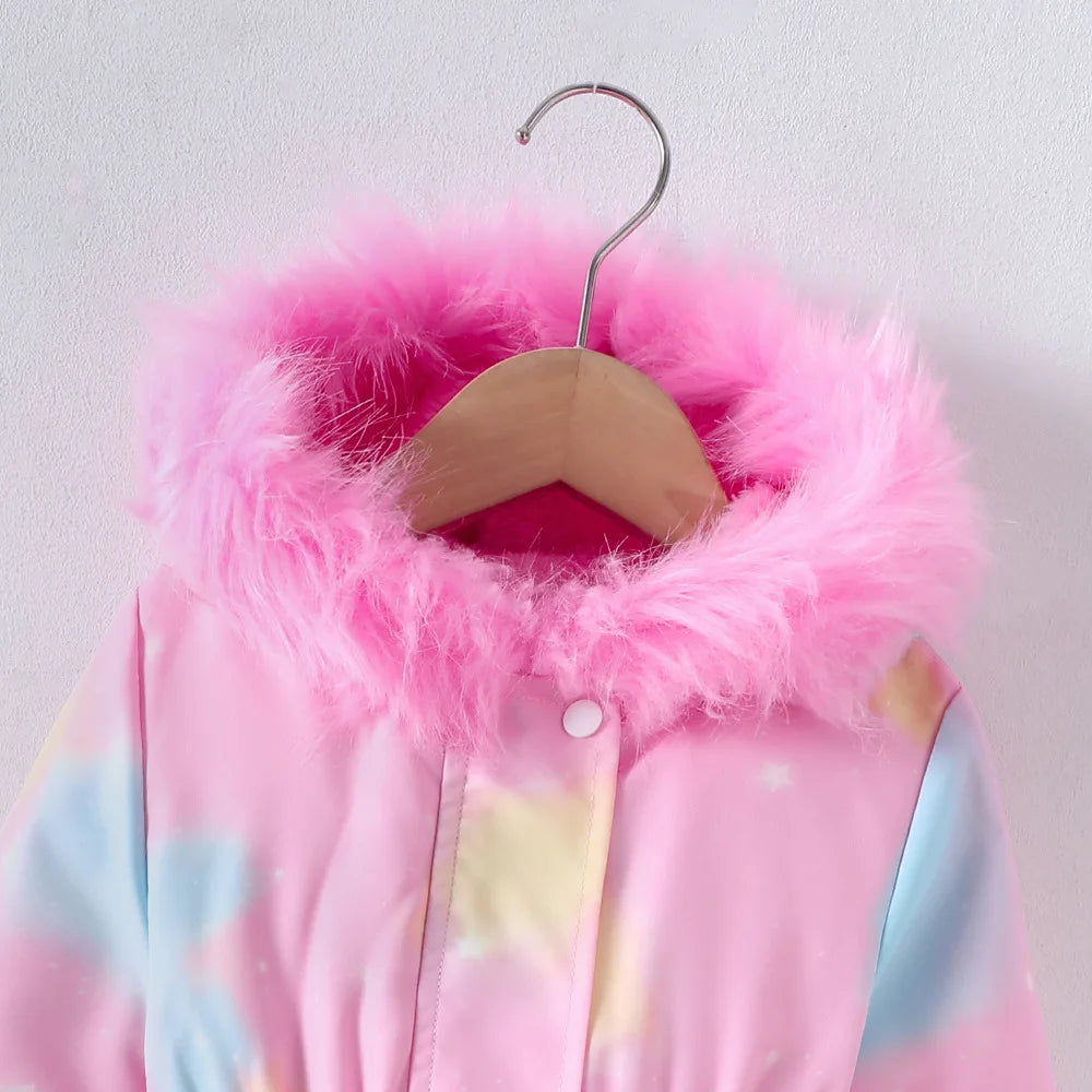 Dívčí pohodlná zimní bunda s jednorožcem a chlupatou kapucí. Více barev na výběr.
