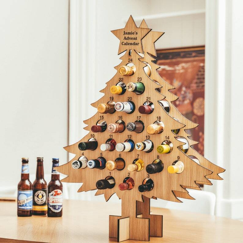 Dřevěný adventní stojan na víno ve tvaru vánočního stromečku. Stromeček obsahuje 24 míst.