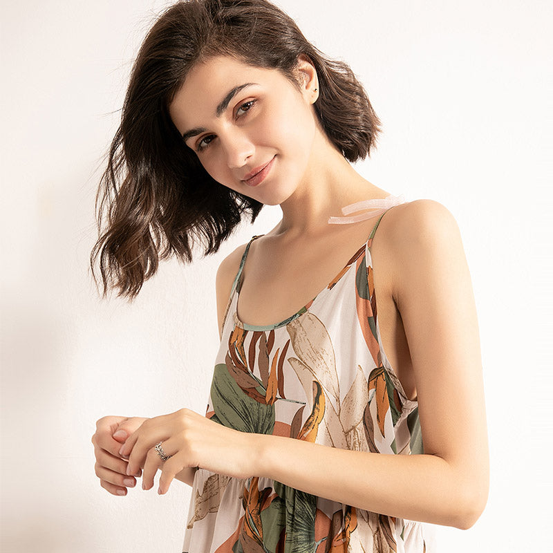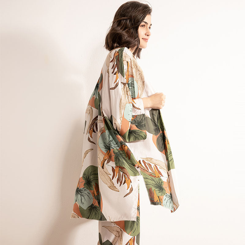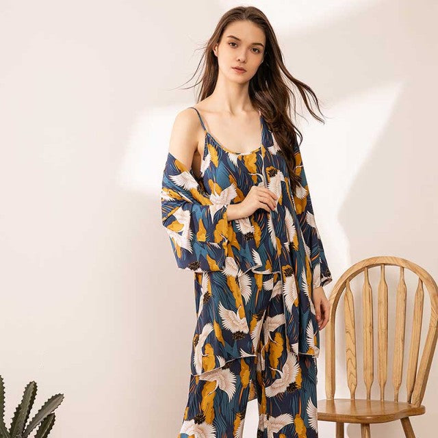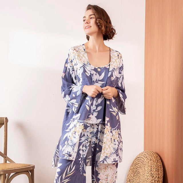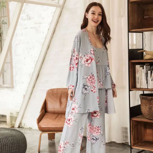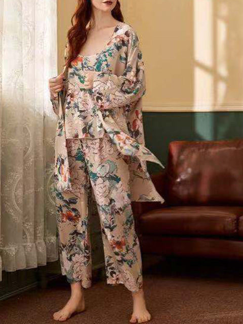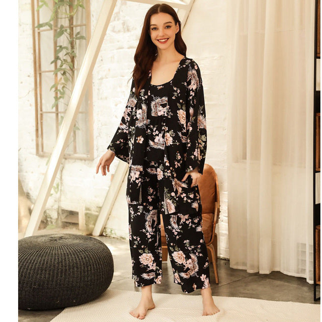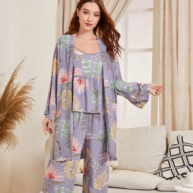Elegantní stylový pyžamový set se vzorem květin, který obsahuje tílko, dlouhé kalhoty a přehoz.