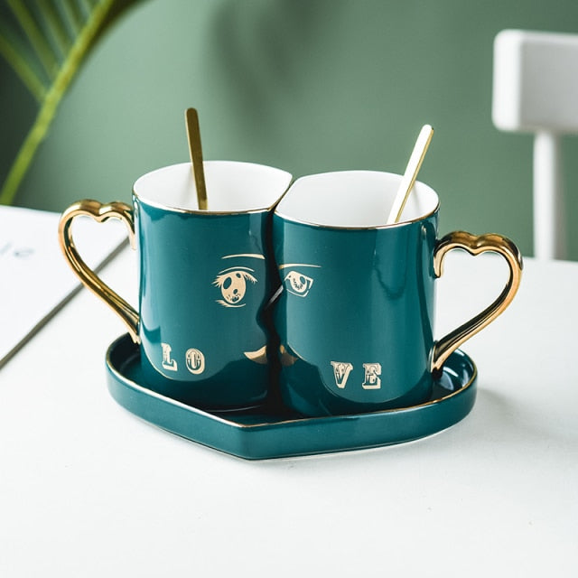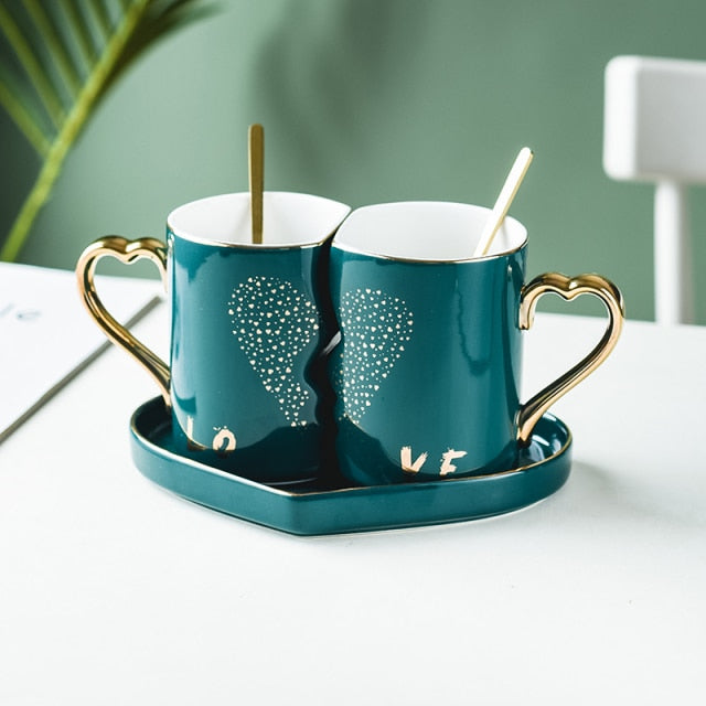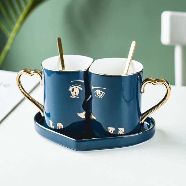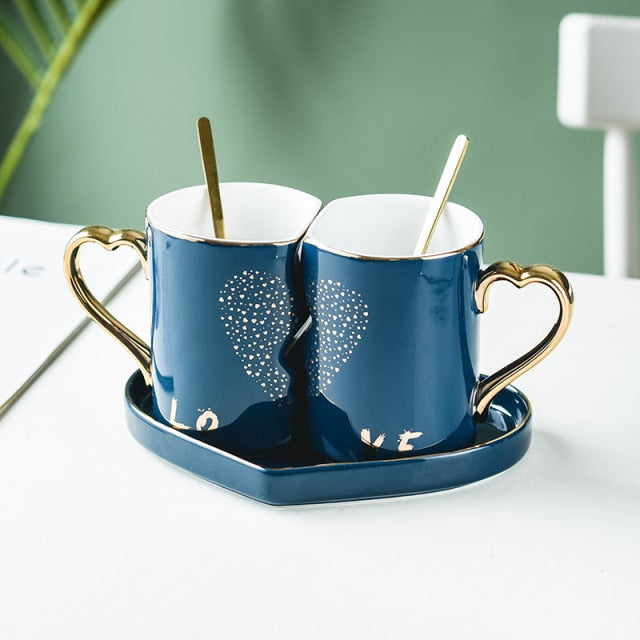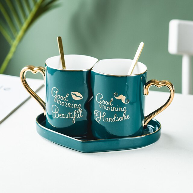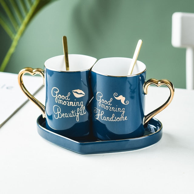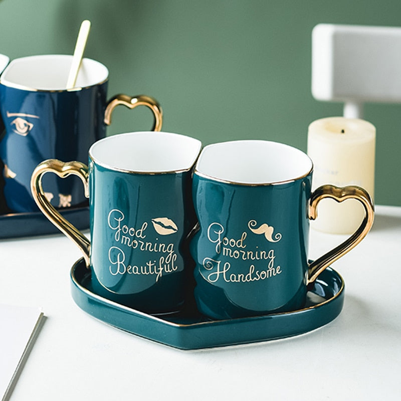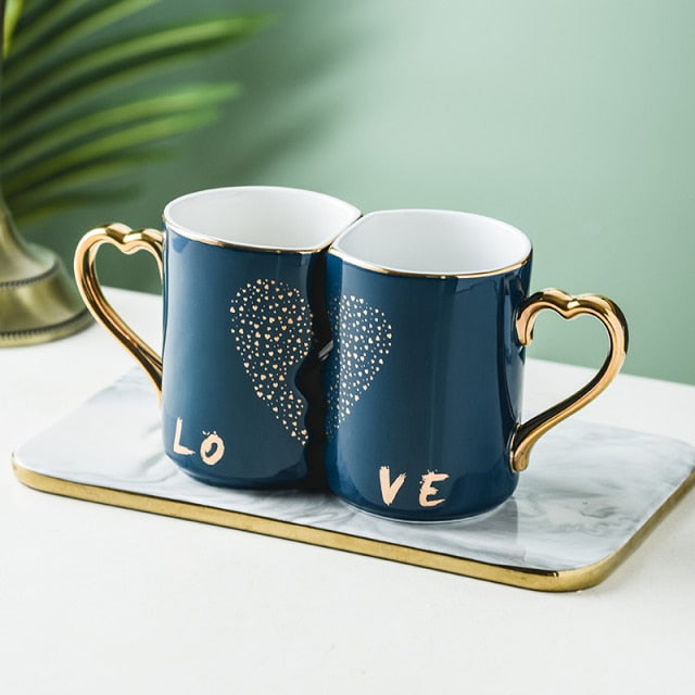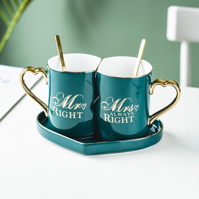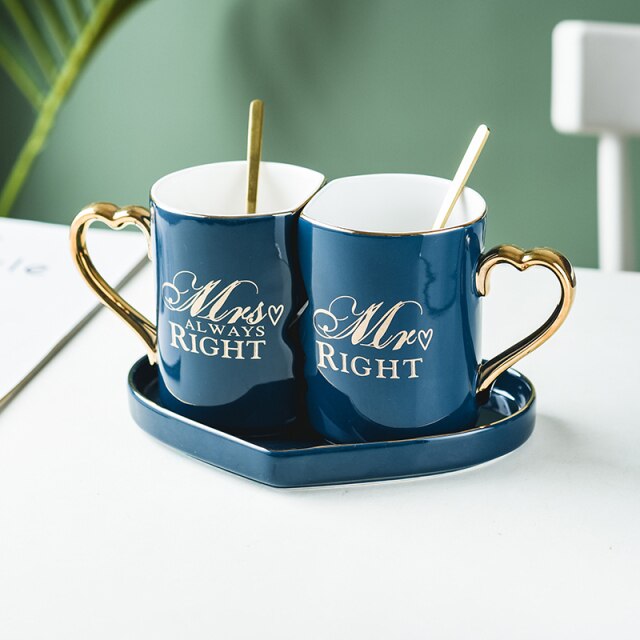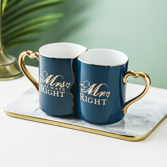 Keramické moderní hrnky s nápisem Mrs. a Mr. ve zlaté barvě.