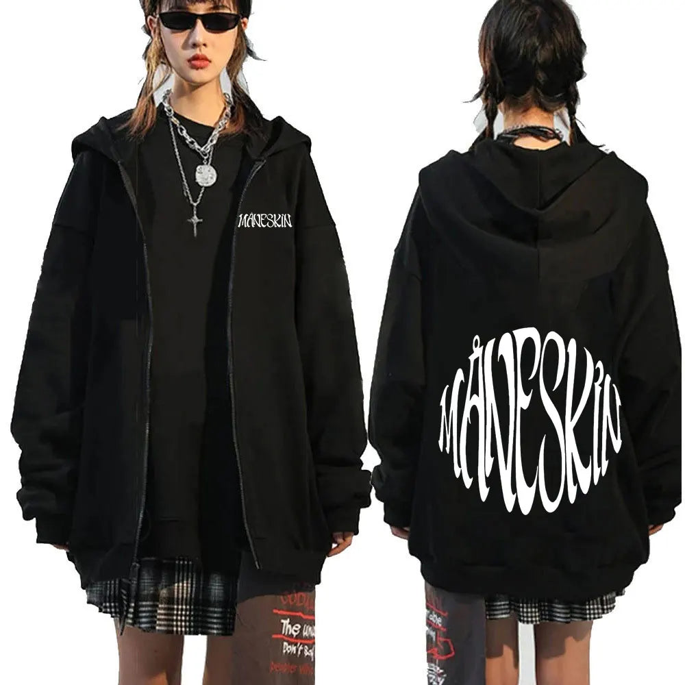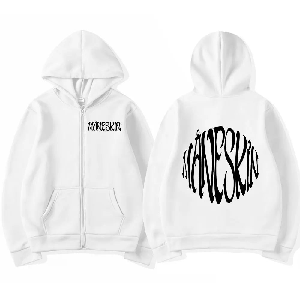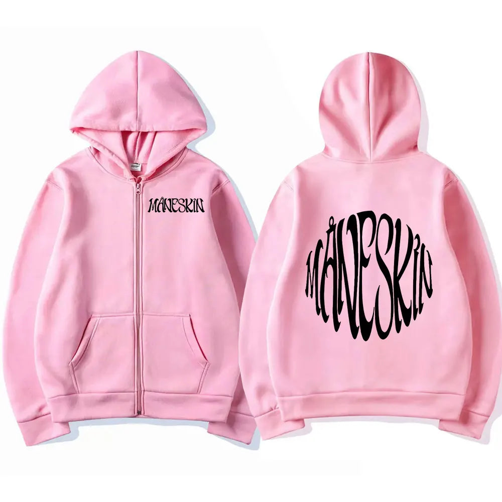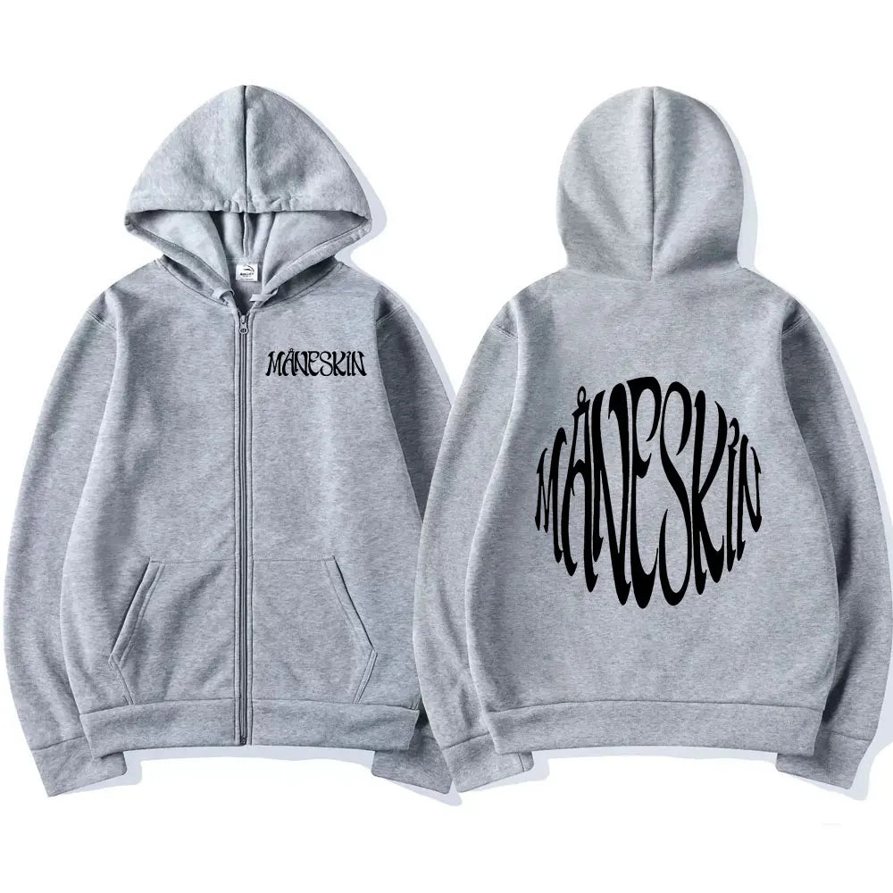 Pohodlná mikina na zip s potiskem Maneskin s kapucí ve více barvách na výběr.