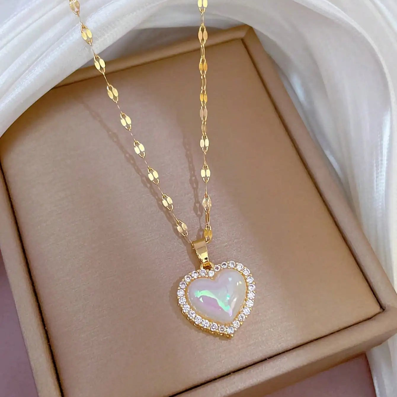 Zlatý náhrdelník ve stylu perleťového srdce.