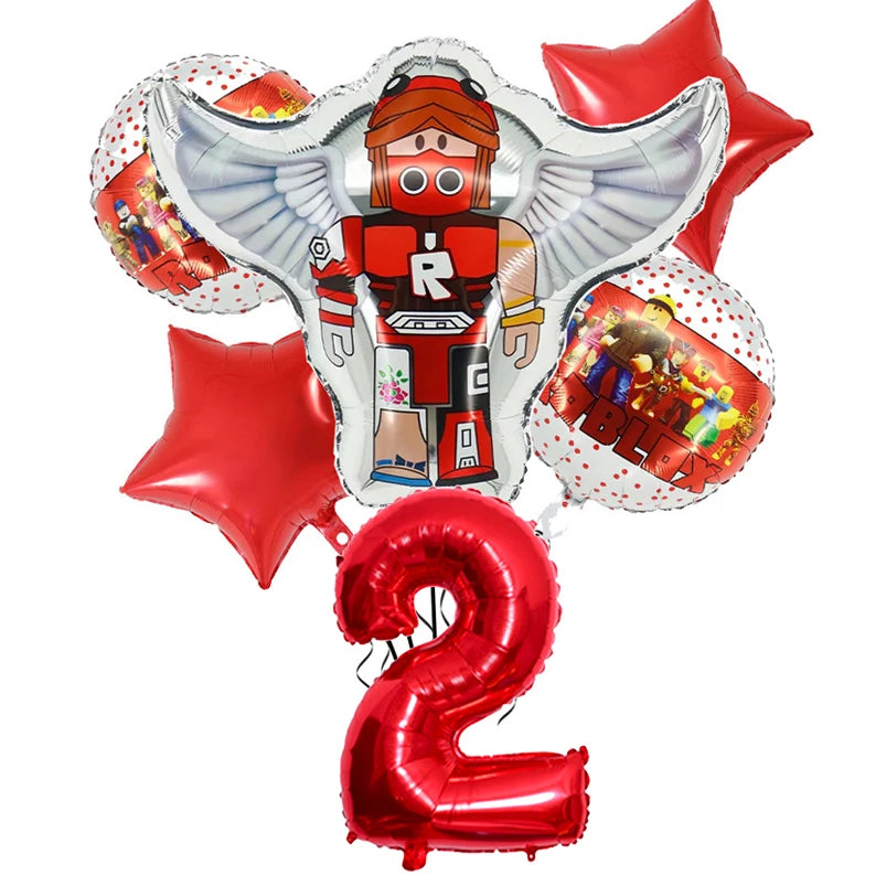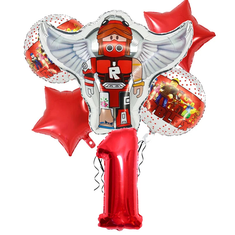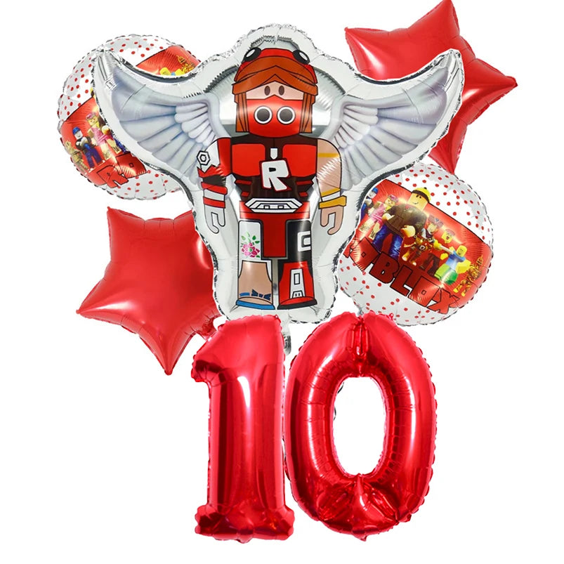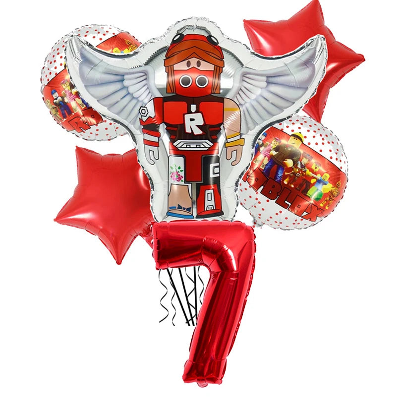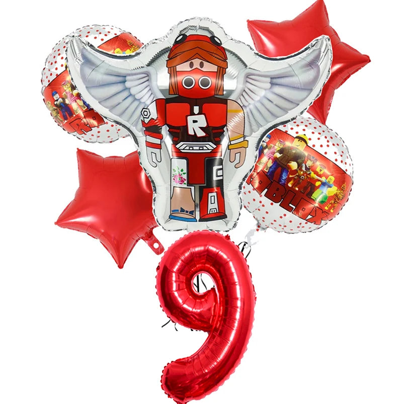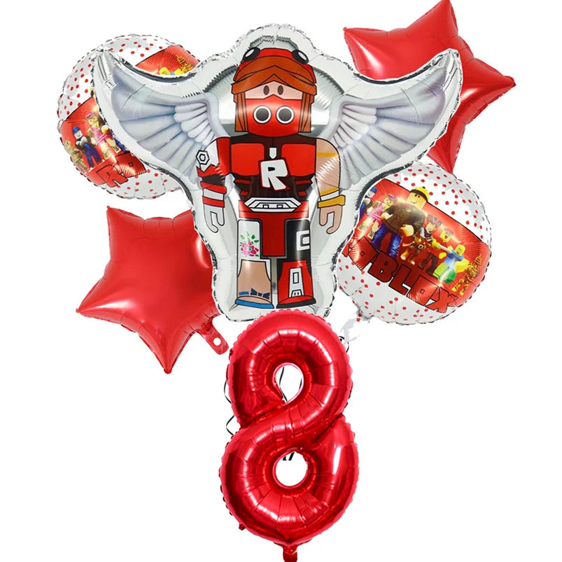 Narozeninové balónky se vzorem Roblox v červené barvě s číslem.