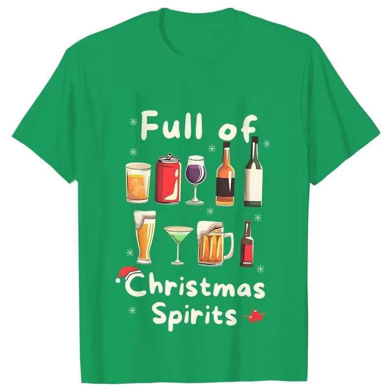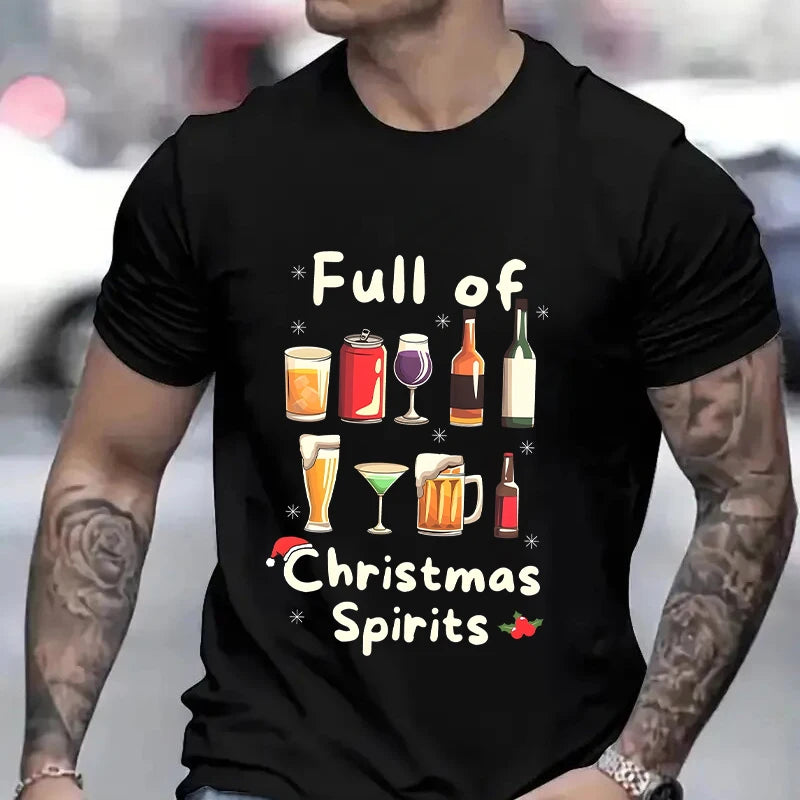 Pánské stylové vtipné vánoční triko s krátkým rukávem a nápisem Full of Christmas Spirits.