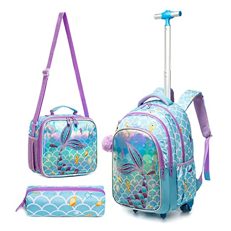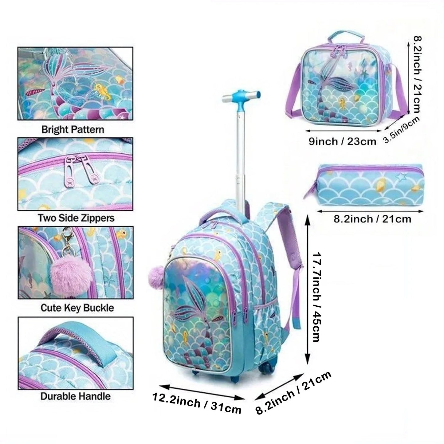 Set stylového školního batohu na kolečkách se vzorem mořské panny, fotbalového míče a další. Batoh obsahuje 3 kapsy na zip a dvě boční kapsy.