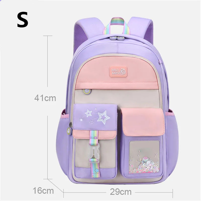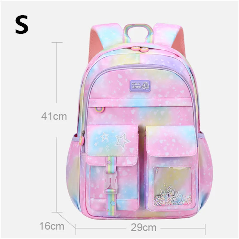 Školní roztomilý duhový batoh v růžových a fialových barvách.