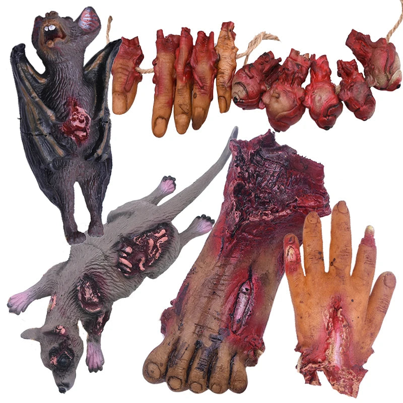 Strašidelná dekorace na Halloween ve tvaru krvavé nohy, ruky a zvířat.