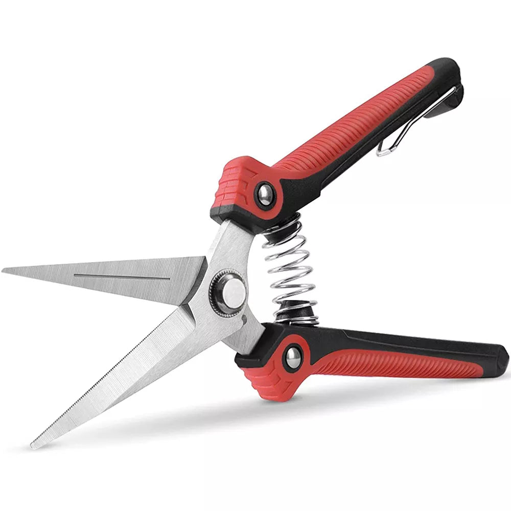 Zahradní nůžky na větve. Dlouhá rovná čepel zahradních prořezávacích nůžek může snadno vstoupit do úzkého prostoru a bez námahy odstřihnout větvičky a plody přichycené k rostlinám. Zahradnické nůžky jsou vhodné pro stříhání odumřelých květin, stonků stromů, růžových keřů, keřů, malých sazenic, sklizeň zeleniny.